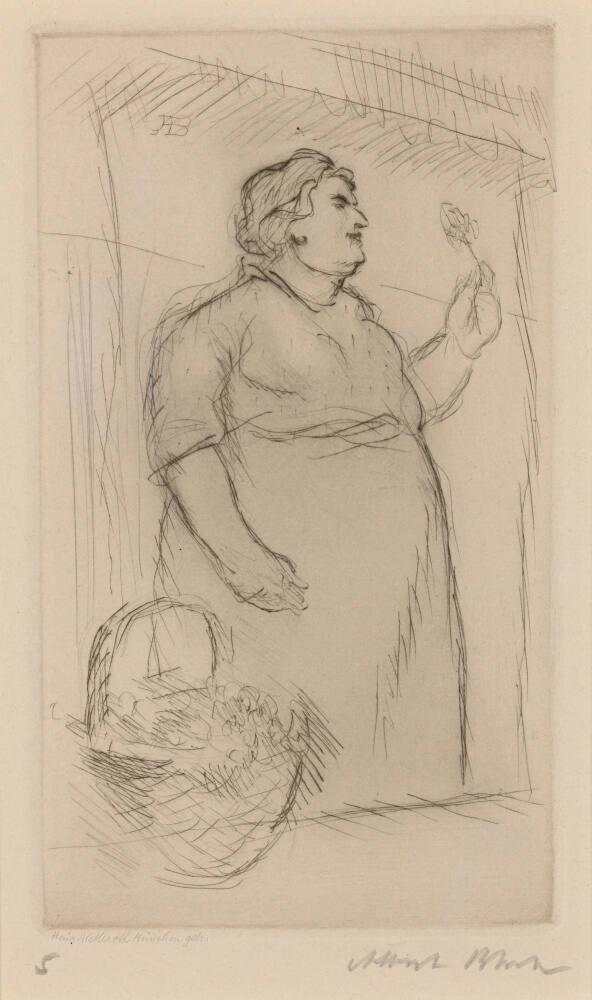 DescriptionUsing fine black lines, this vertically oriented drypoint print depicts a standing, full-bodied woman. With the woven basket beside her at the left side of the image, she occupies the majority of the composition. She is standing with her body in a three-quarters profile pose, while her head is turned to the right in profile. Her proper right arm hangs at her side, while her proper left arm is extended, and bent at the elbow. She holds a flower in her proper left hand. The ambiguous environment within which the woman stands is suggested through a series lines that frame her body. Above her head and near the upper left corner of the image is the monogram “AB.”Exhibition HistoryNone
