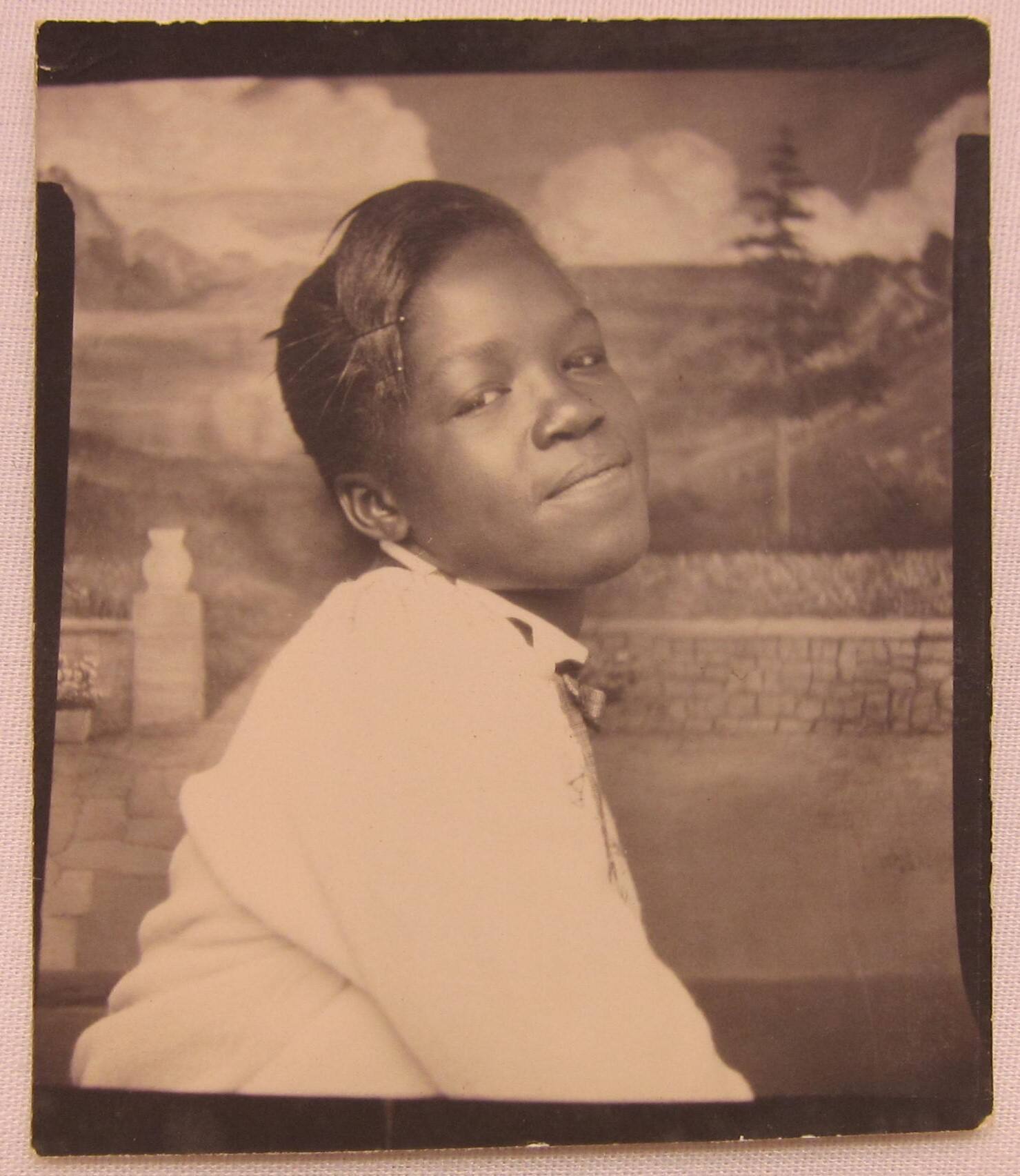 DescriptionPhoto booth image of young woman seated in profile with her head turned toward the camera. Bobby pins hold back her short hair and she looks on with a slight smile. The backdrop depicts a stone fence in front of a scenic landscape with an evergreen tree, mountains, and clouds.ProvenancePurchased from Daniel Vahnke, Phoenix, AZ by Peter J. Cohen, New York, NY;