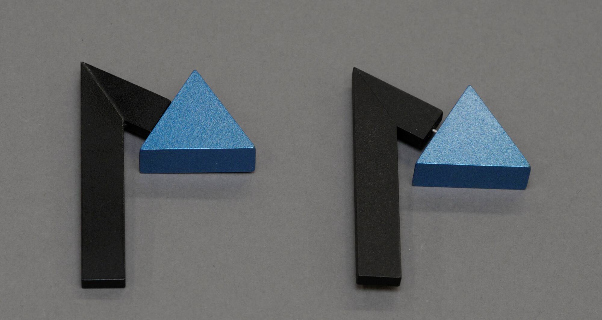DescriptionA pair of earrings with a flat black L-shape, tipped with a flat blue triange.