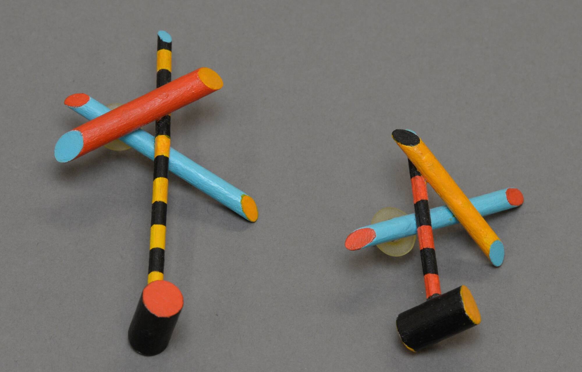 2017.80.10.2 consists of four rods: one yellow, one light blue with the artist's signature, one orange and black striped, and one black with yellow ends.