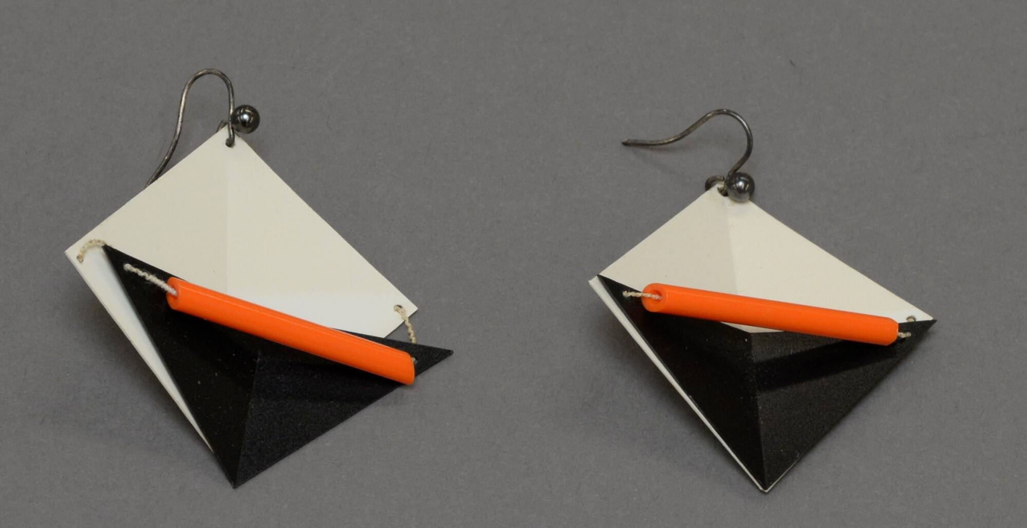 DescriptionWhite squares with black triangles overlayed and thin orange bead sewn across the center, where the triangles meet.Copyright© Julia Manheim