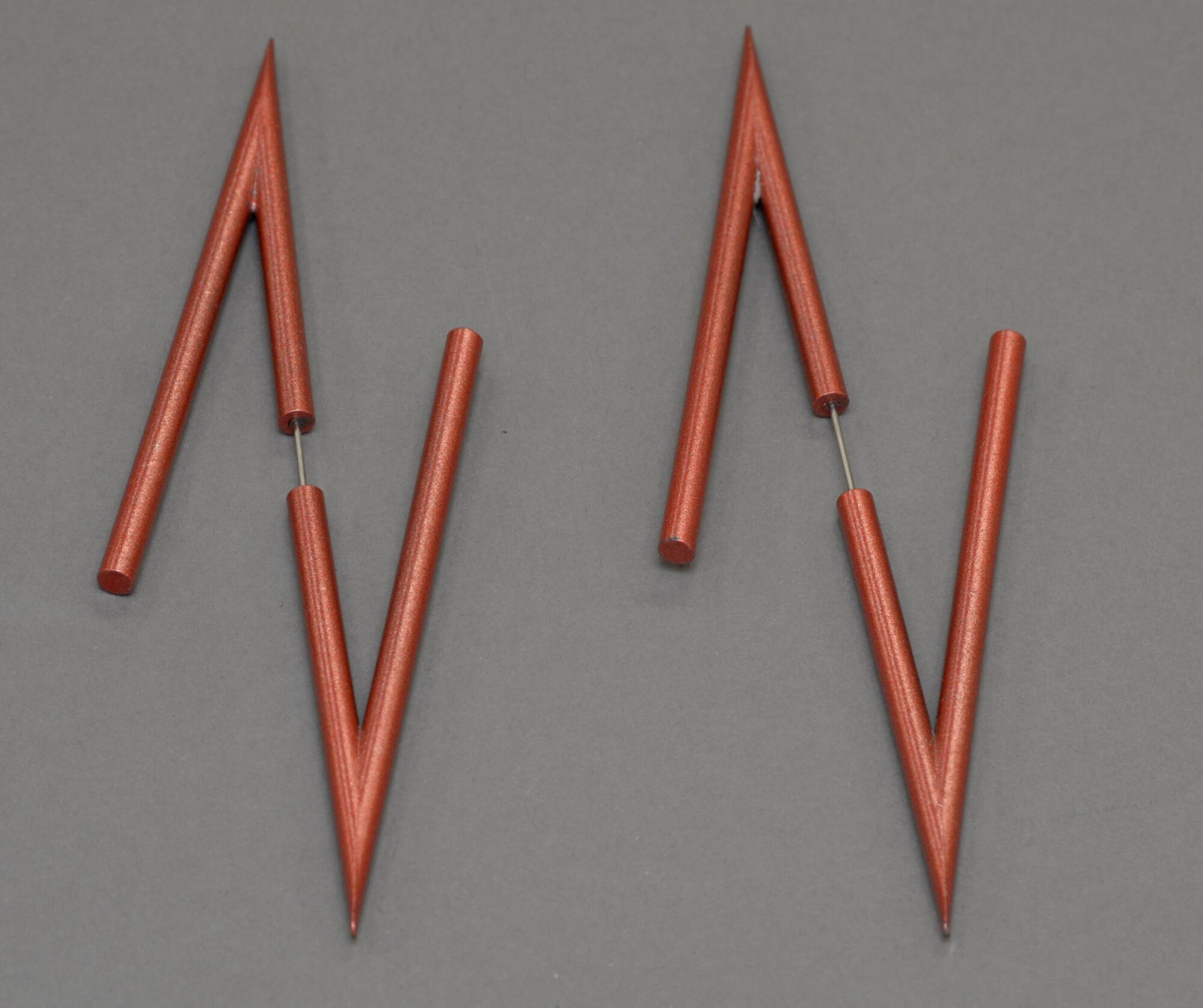 DescriptionEarrings constructed with a red cylindrival rod in a V-shape that when worn resembles a bolt of lightening through the ear.