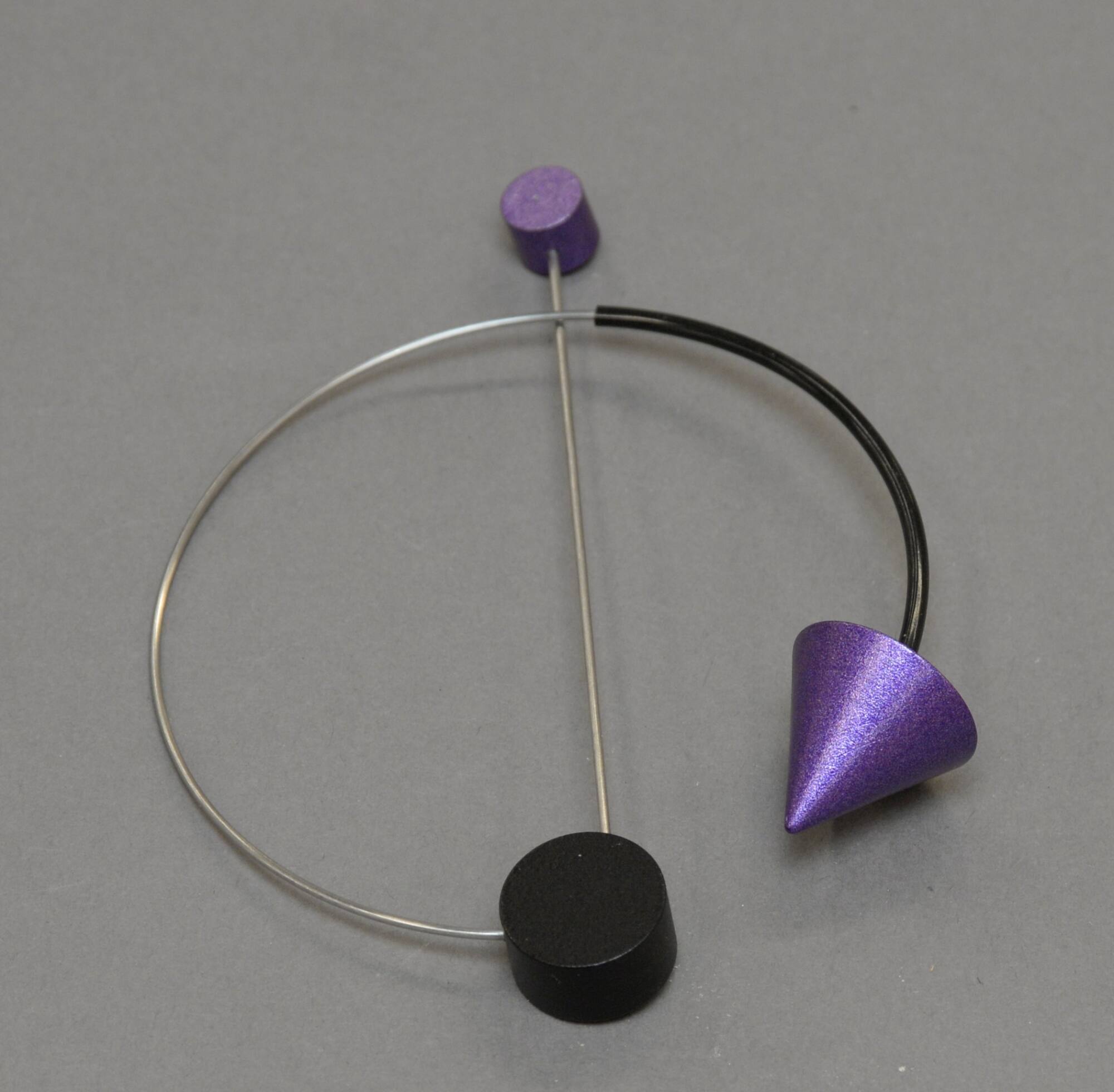 DescriptionAn incomplete circular brooch with a pin down the center, a flat back circle on the bottom, and topped by a small flat purple circle. The incomplete side of the circle is capped with a purple cone.