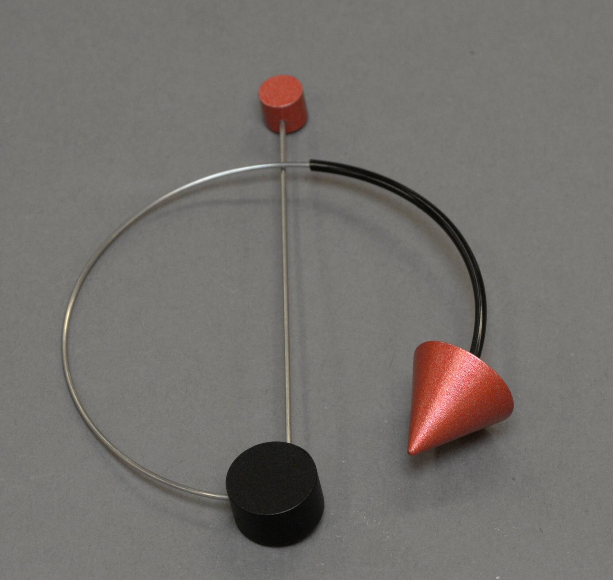 DescriptionAn incomplete circular brooch with a pin down the center, a flat back circle on the bottom, and topped by a small flat red circle. The incomplete side of the circle is capped with a red cone.