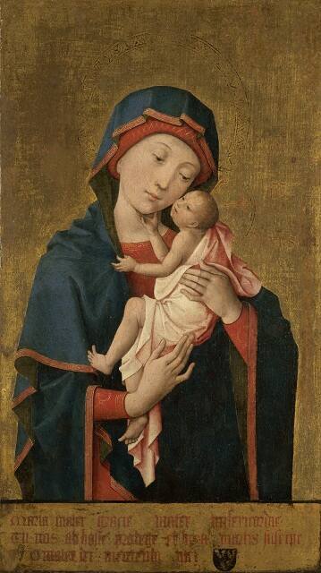This is one of many versions of this composition painted by Hayne de Bruxelles for Philip III, Duke of Burgundy, and presented as gifts to encourage support for a crusade against the Turks. The motherly tenderness of the Virgin towards the child reflects demands for direct emotional experience in religious art of the time.