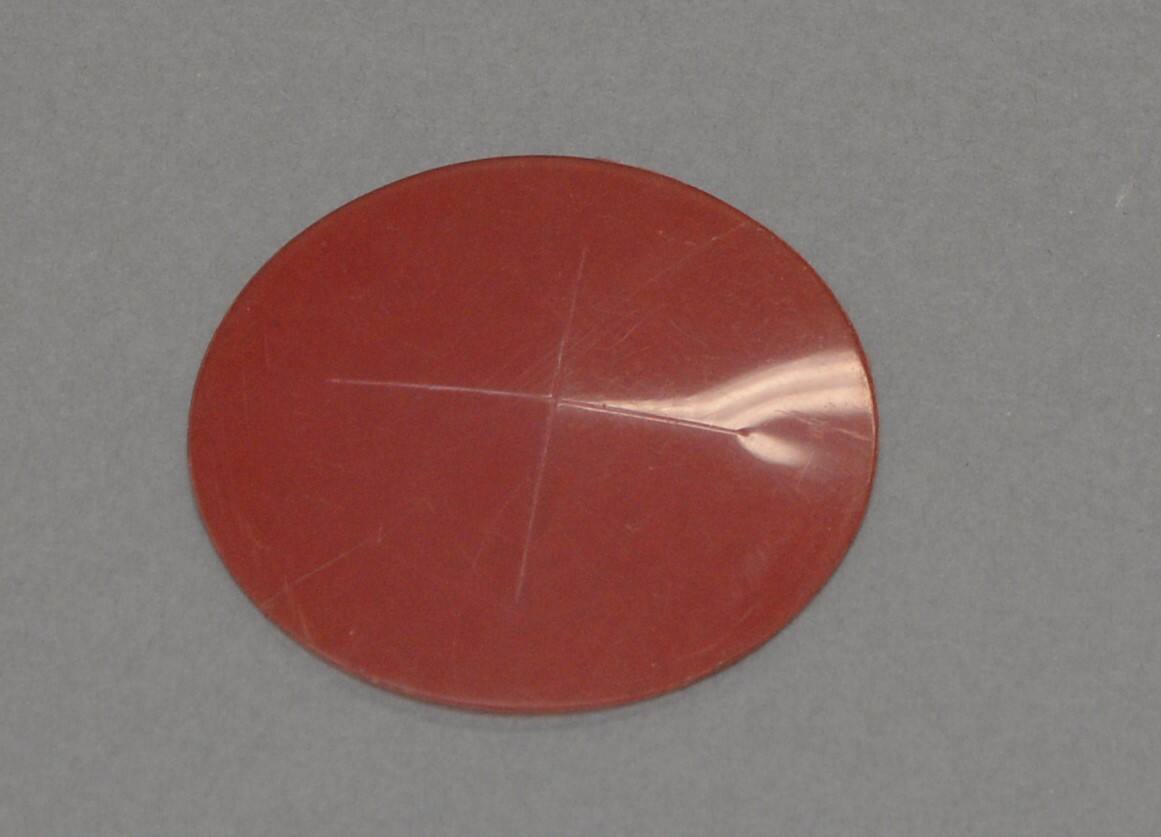 DescriptionTiny red plastic brooch with slits in the shape of a cross cut into the center.Copyright© Caroline Broadhead