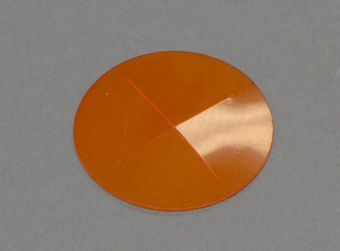 DescriptionTiny orange plastic brooch with slits in the shape of a cross cut into the center.Copyright© Caroline Broadhead