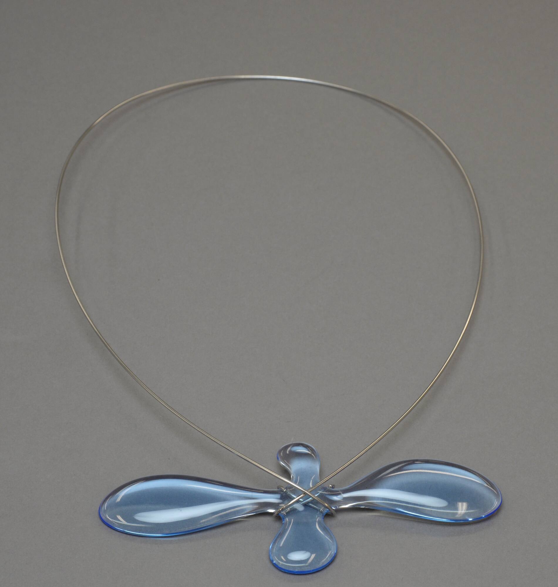 DescriptionA steel rod necklace in a teardrop shape, with a transclucent pale blue bulbous abstracted cross.