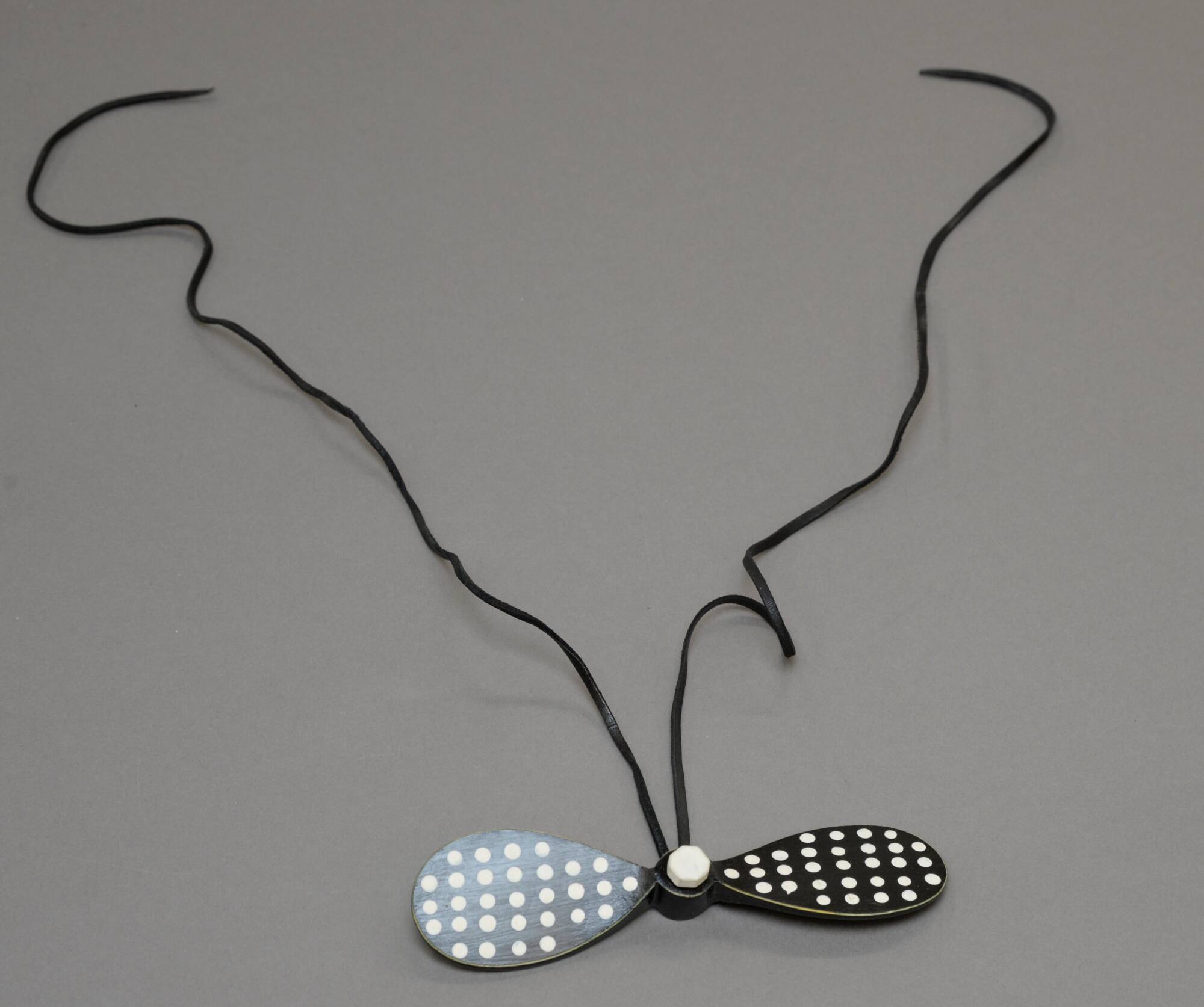 DescriptionBlack wooden bowtie with white polkadots atatched to a black leather string.