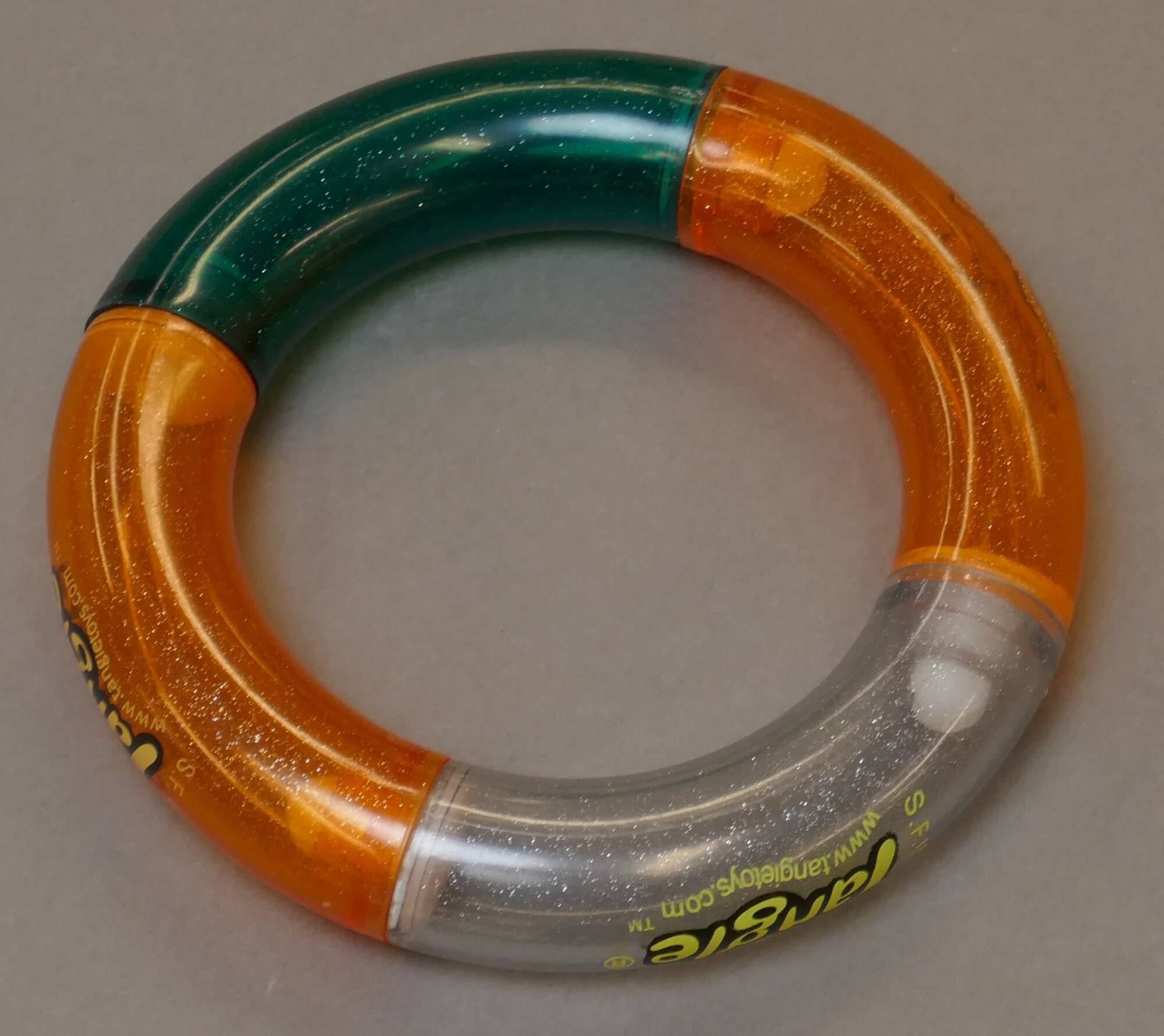 DescriptionA bangle made of four "Tangle" pieces: two transluscent orange, one transluscent green, and one transluscnet grey.