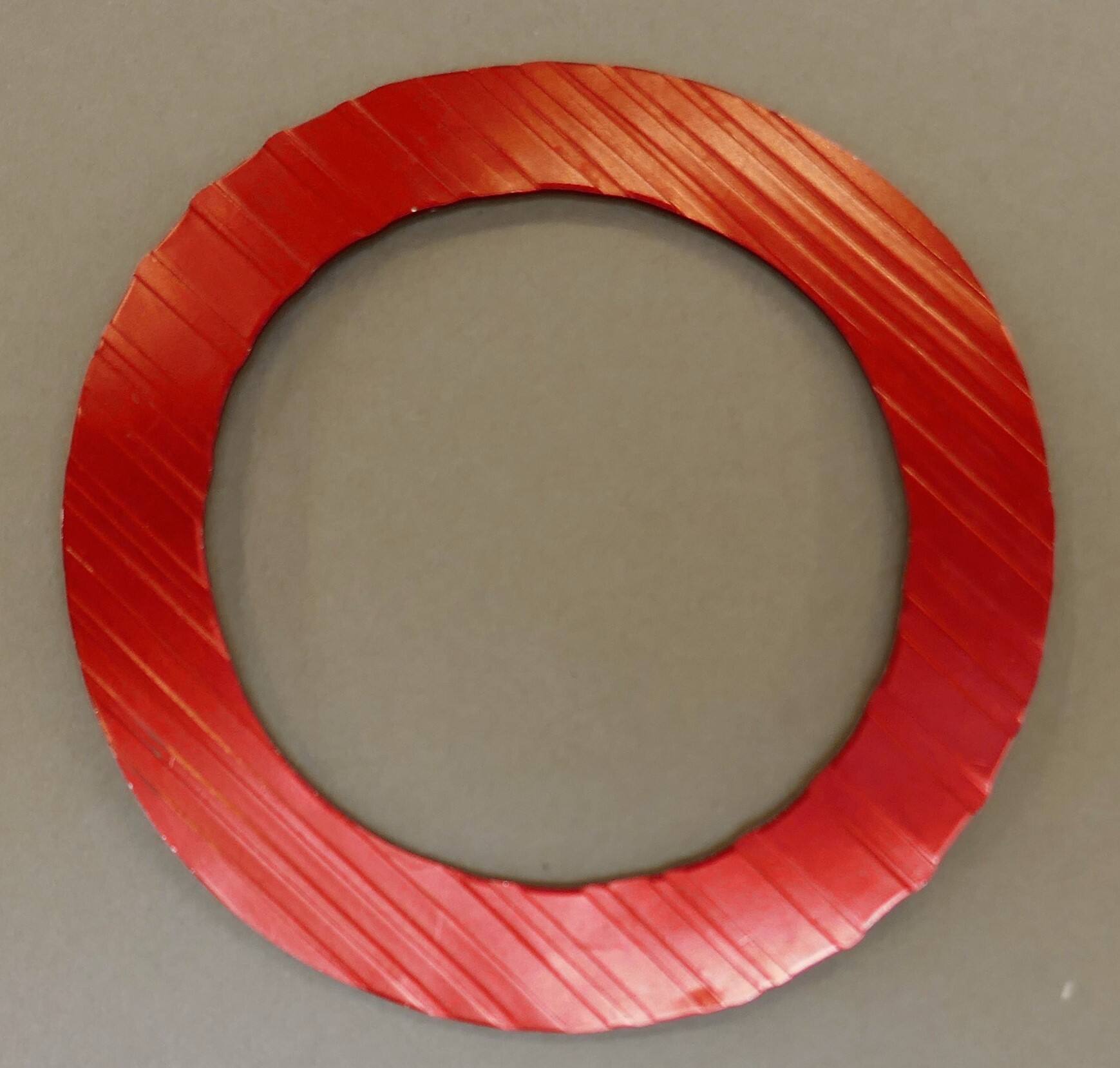 DescriptionA red flat silver bangle with impressed lines.