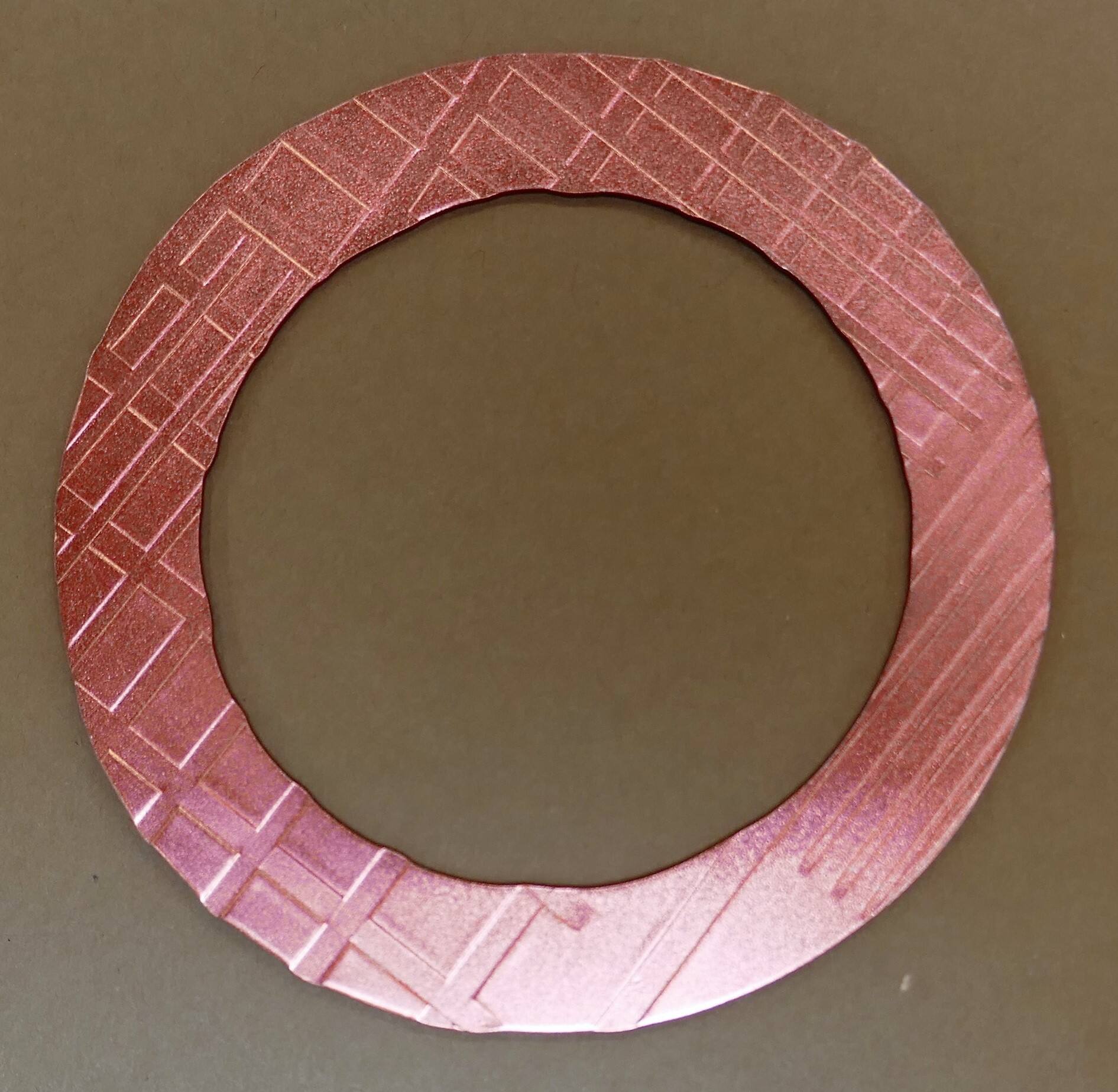 DescriptionA pink flat silver bangle with impressed lines.