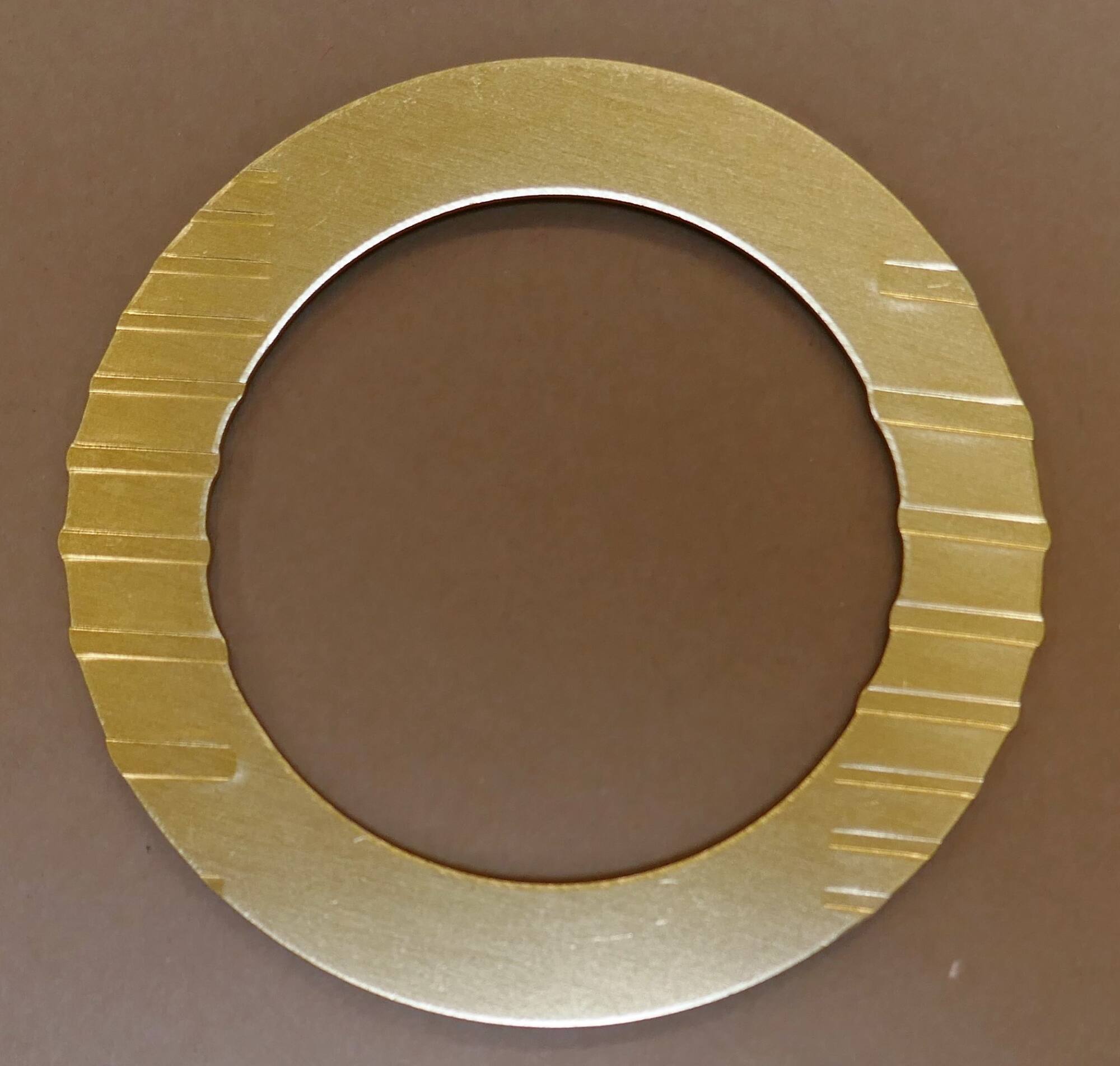 DescriptionA gold colored flat silver bangle with impressed lines.