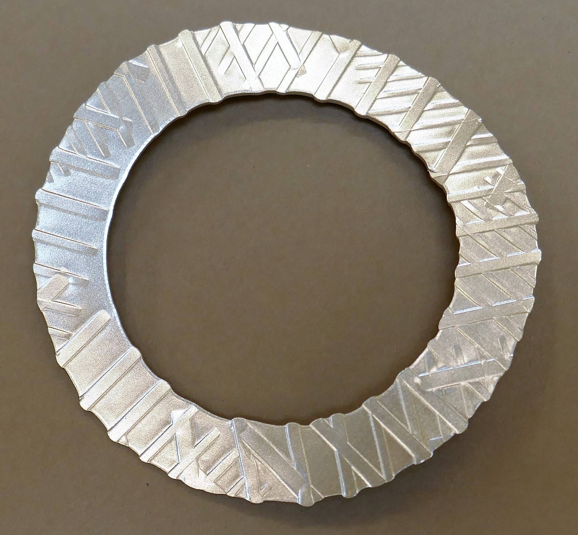 DescriptionAblue flat silver bangle with impressed lines.