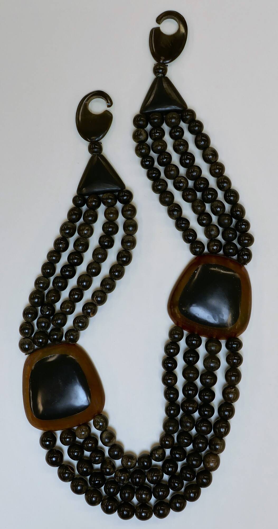 DescriptionFour strands of black wooden spherical beads, and two large organic shaped pendants in black with a wood color base on either side of the necklace.