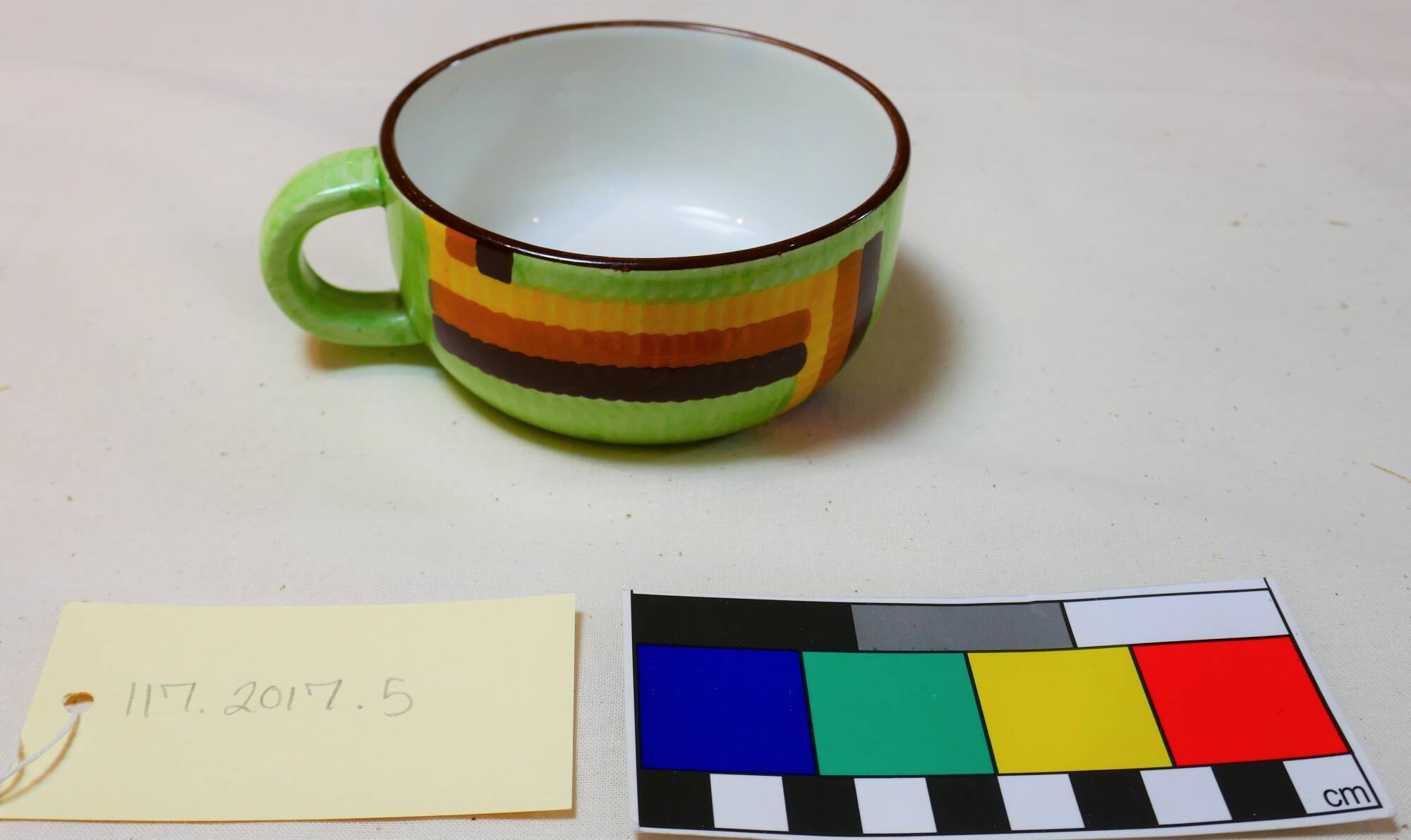 DescriptionThis five-part tea service is comprised of a teapot with lid, a sugar bowl with lid, creamer, and two cups and saucers. The teapot, sugar bowl, and creamer are cylindrical with flat sides and decorated in a pale lime wash background with a geometric zigzag stripe of yellow, orange and brick red. These bands create a stepped pattern across the surface. The teapot has a triangular shaped spout growing from the curves of the cylinder and a trapezoidal shaped lid, inset into the top of the pot. The teapot and creamer handles are flat bands creating a semi-circle. These handles have a brick red colored stripe on their edges. The creamer mimics the teapot in form but is smaller in scale. The sugar bowl and creamer are of similar scale and shape. Like the teapot, the sugar bowl contains a lid that follows the curve of the vessel. The two cups are short with wide mouths, and the matching saucers have slightly flared concave lips. The teacups and saucers share the same stepped-pattern decoration as the teapot, sugarbowl and creamer. The saucers have the zigzag stripes across the plate’s surface, creating a large Z-shape.Exhibition History