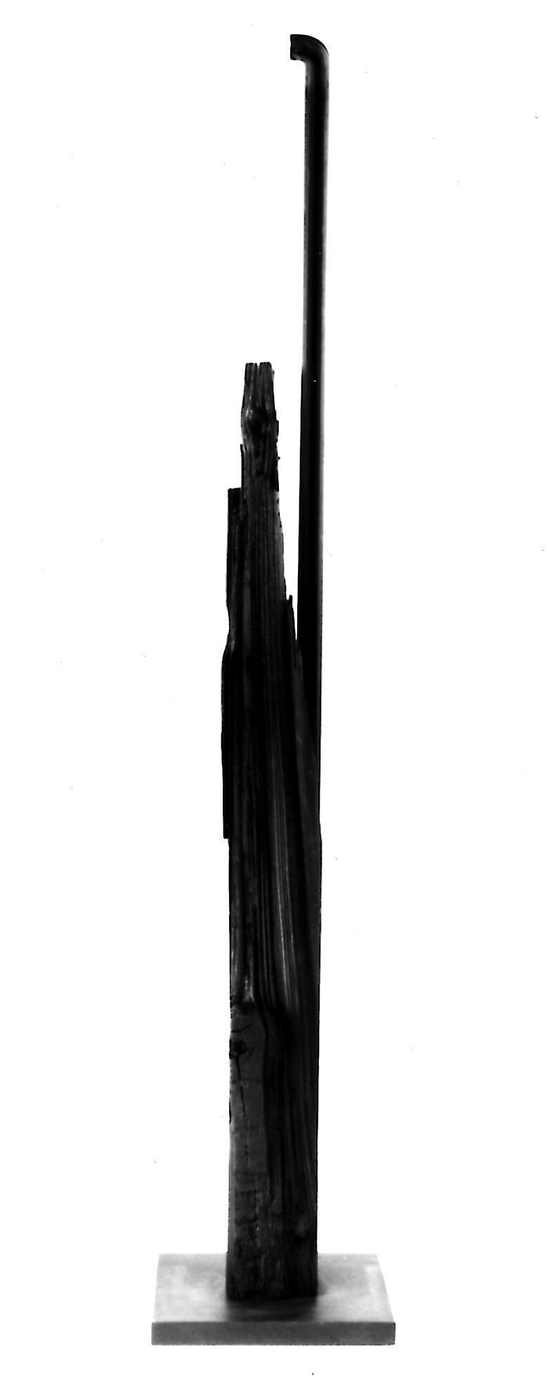 DescriptionSlender, black, vertical structure united at base and breaking into 2 separate vertical elements at approximately half-way point. Left element is of roughly grained, torn wood. Right element is regular and pipe-like, extending approximately 38 inches above left element and bending at a curved right angle back toward this rough-cut element for an additional 2 inches.Gallery LabelIn style, Untitled belongs to Louise Nevelson's totemic and columnar works. Its striking verticality is an assertion of being, singularity and presence in the world. But for Nevelson, nothing in the world exists apart from the whole: "Every piece that I make becomes a very living thing to me. When I work I'm not searching for perfection. I'm searching for life."
