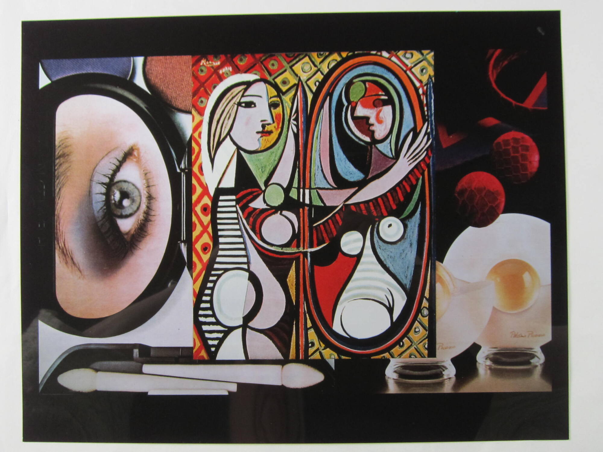 DescriptionComposite image of a woman's eye visible in a makeup compact, a Picasso painting in which a woman stands before an oval mirror, and two Paloma Picasso perfume bottles.Provenance