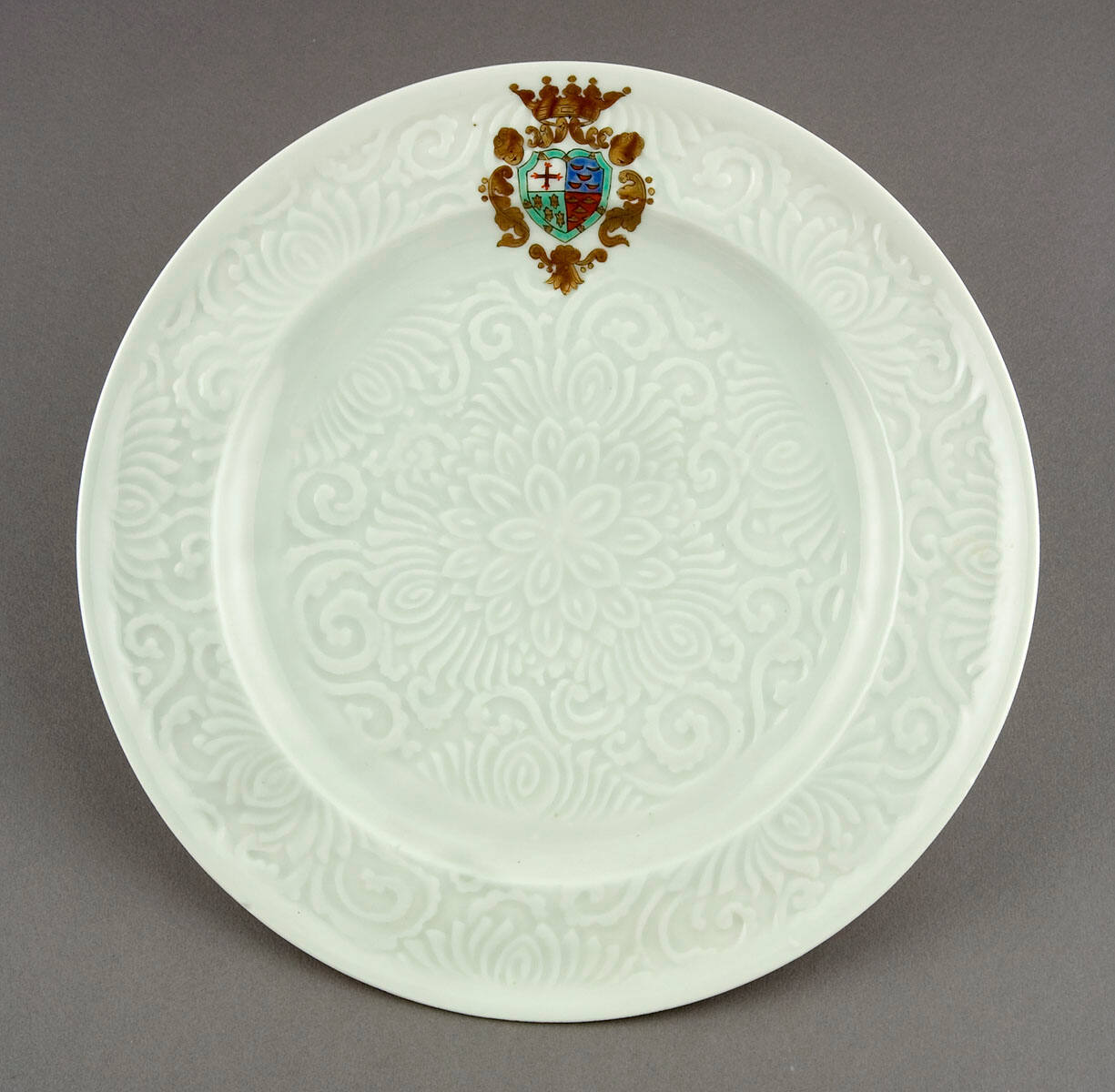DescriptionPlate with depressed center and 1 1/4 " wide rim, raised white on white patterns of floral, S and C curves on rim and in center, smooth areas at outside edge of rim and outer part of depressed area, armorial design in gold leaf, red, blue and green placed at one side.