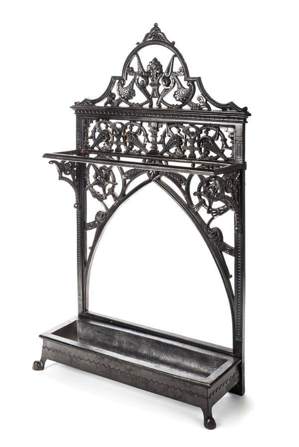 DescriptionA cast iron umbrella stand with protruding railing and removable drip tray. A crested semi-circular-arch of pierced symmetrical stylized plant and flower forms sits atop an overall rectilinear shape. Below the arch, a rectangular frieze is ornamented with open, symmetrical patterns and designs including sinuous plant forms. The central back of the stand has two stylized star forms that flank the upper corners of an open-pointed arch, below the open functional railing. The bottom rail, which holds the undecorated drip tray, includes a single solid line of zigzag banding.