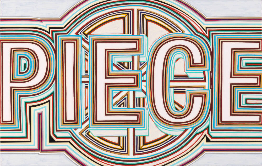 DescriptionThis painting depicts the word “Piece” in multi-colored stripes. The word completely fills the space of the painting, extending from top to bottom and from one side to the other.Exhibition History