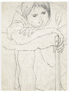 DescriptionThis print functions as a black and white drawing depicting a person sitting on a chair. The partial figural form is closely cropped. The person leans forward resting his or her chin on a hand placed over a forearm. A vertical component of part of the chair is seen on the far right. The sitter looks pensively downward. The drawn lines are black and the white surface appears to be highly textural, but is in fact, flat.Exhibition HistoryGeorge Segal Lithographs, Lawrence Gallery, Kansas City, MO, September 14-29, 1979, no. cat.