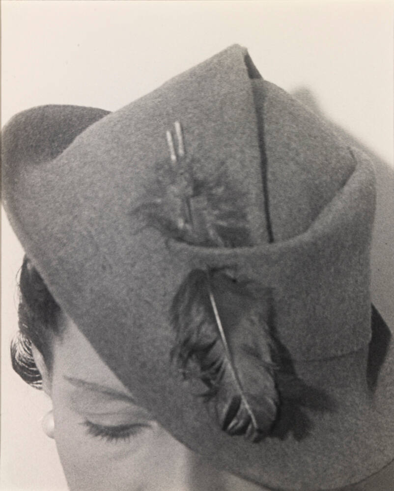 DescriptionImage of a woman wearing a felted wool Peter Pan style hat with two feathers tucked into a folded seam. The woman's head is tilted down so that the hat covers the left side of her face.Gallery LabelIn the 1930s, avant-garde artistic techniques began to permeate fashion design and photography. Ilse Bing’s striking and unusual photograph of a hat designed by the French design house of Caroline Reboux features a slanting angle and tight crop, highlighting its textures and form. A self-taught photographer, Bing moved to Paris, France, in 1930, where she worked as a freelance photographer for various European and American publications. She received her first assignments for Harper’s Bazaar magazine thanks to the French-American heiress and socialite Daisy Fellowes (featured in this image).