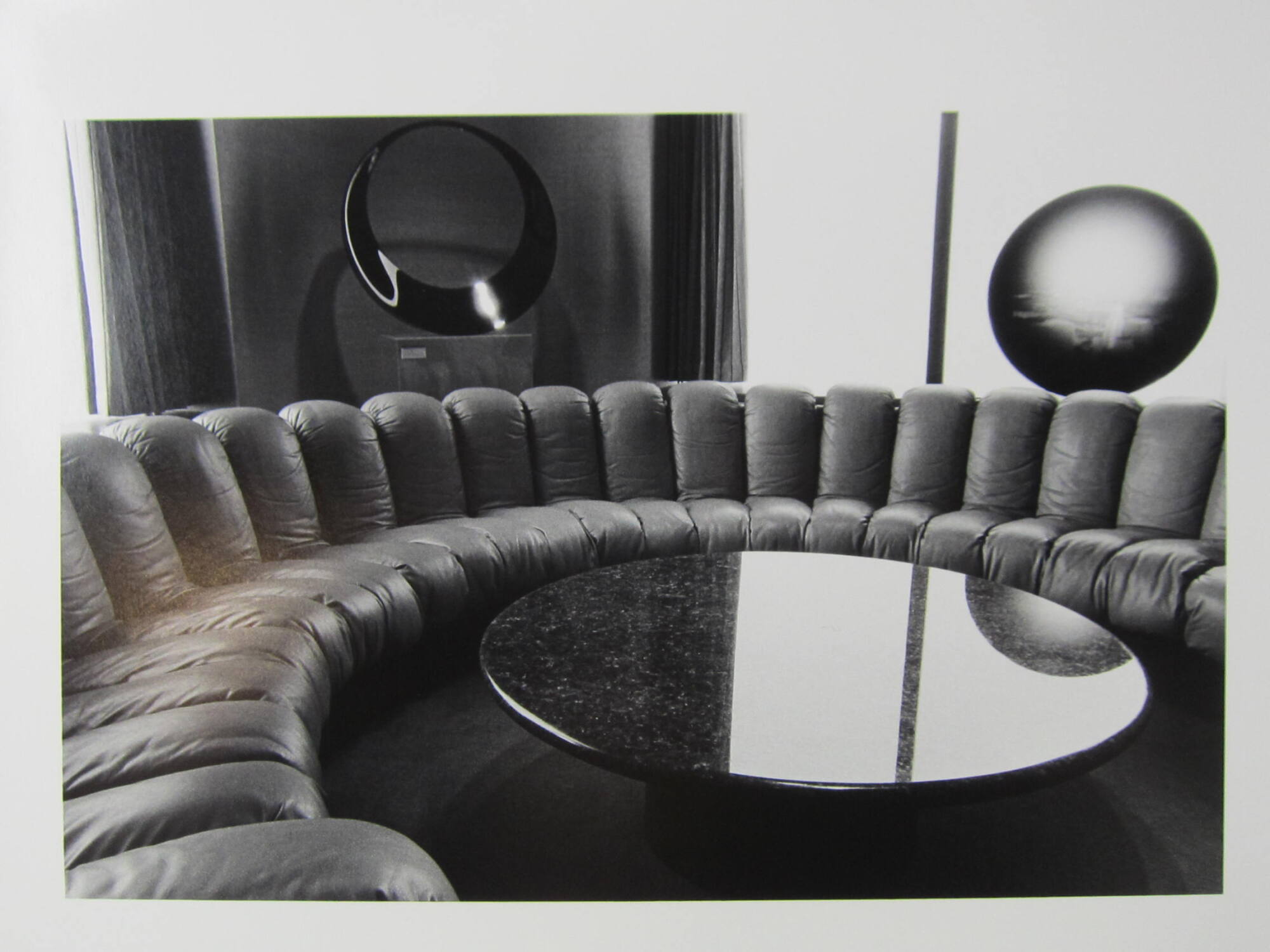 DescriptionImage of a leather sofa which is upholstered in segments and winds around a table in the center. Behind is a circular sculpture displayed on a plinth between two curtained windows.Provenance