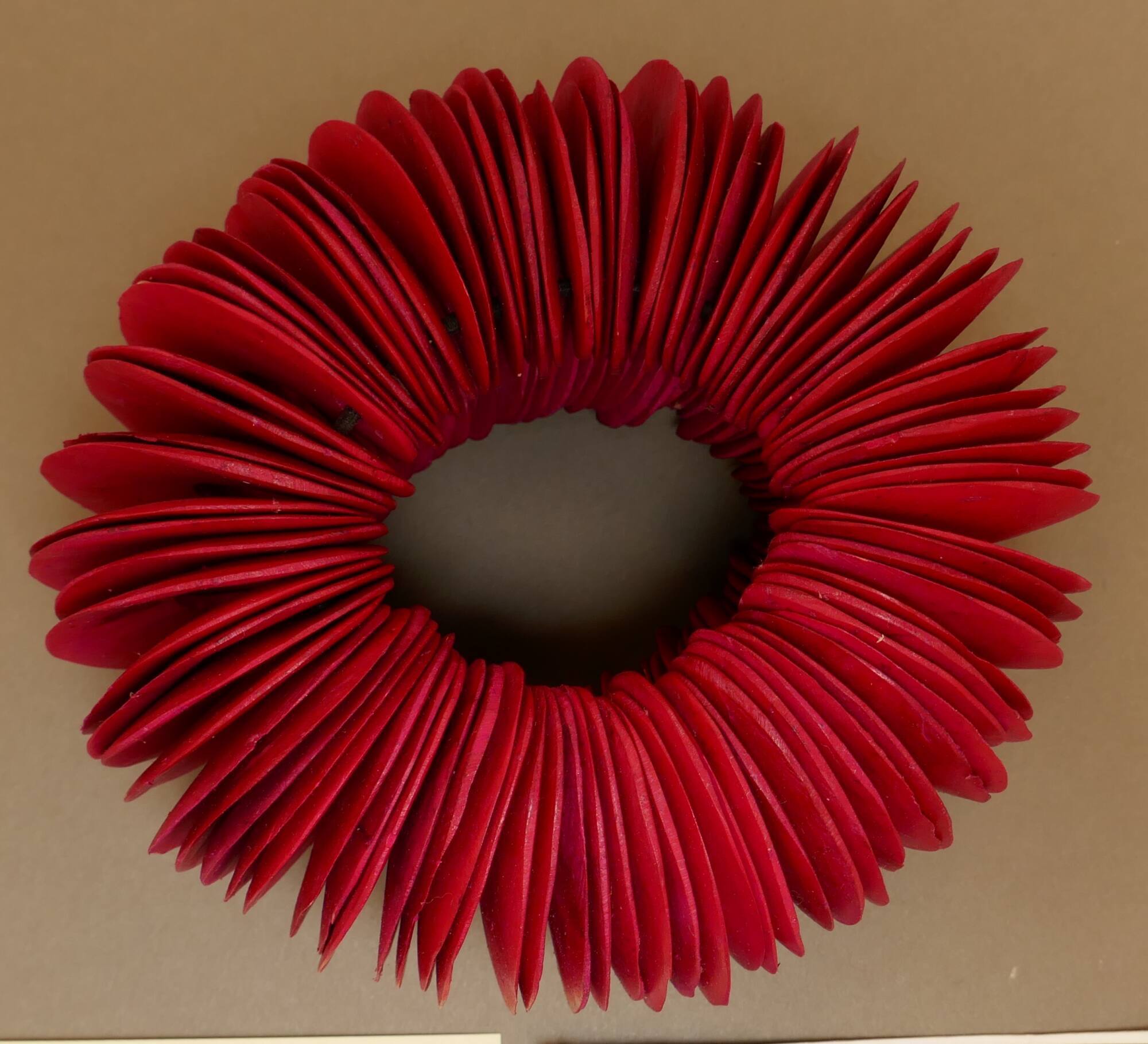 DescriptionMany red semi-circular shapes stacked to create an armlet, roughly resembling a slinky.