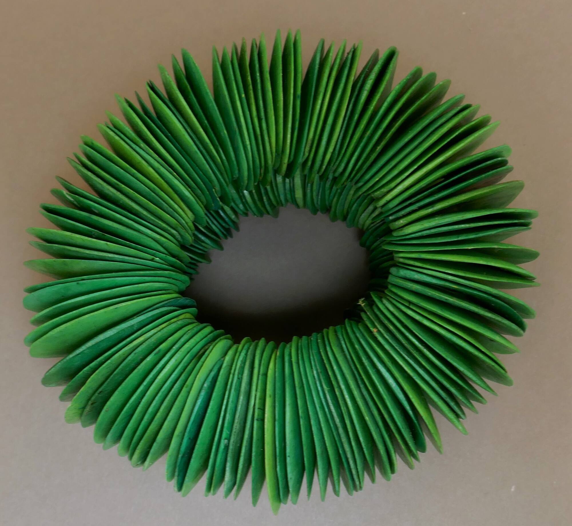 DescriptionMany green semi-circular shapes stacked to create an armlet, roughly resembling a slinky.