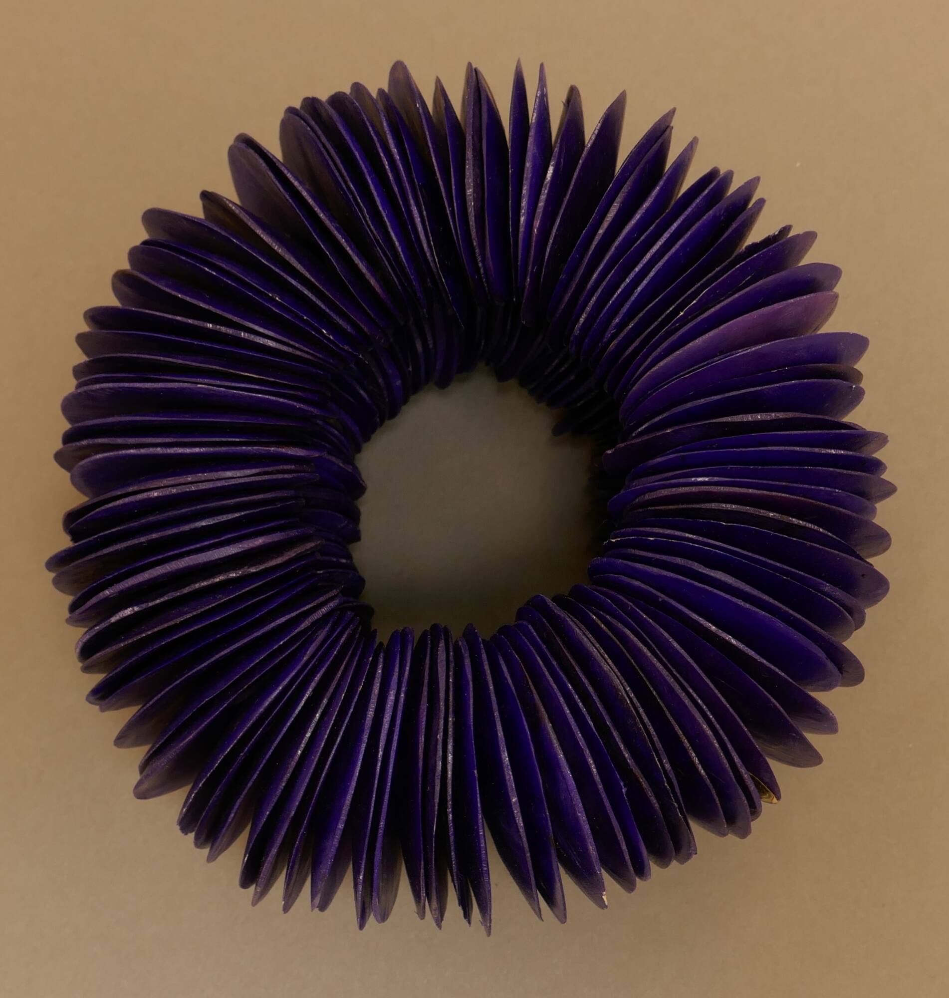 DescriptionMany purple semi-circular shapes stacked to create an armlet, roughly resembling a slinky.