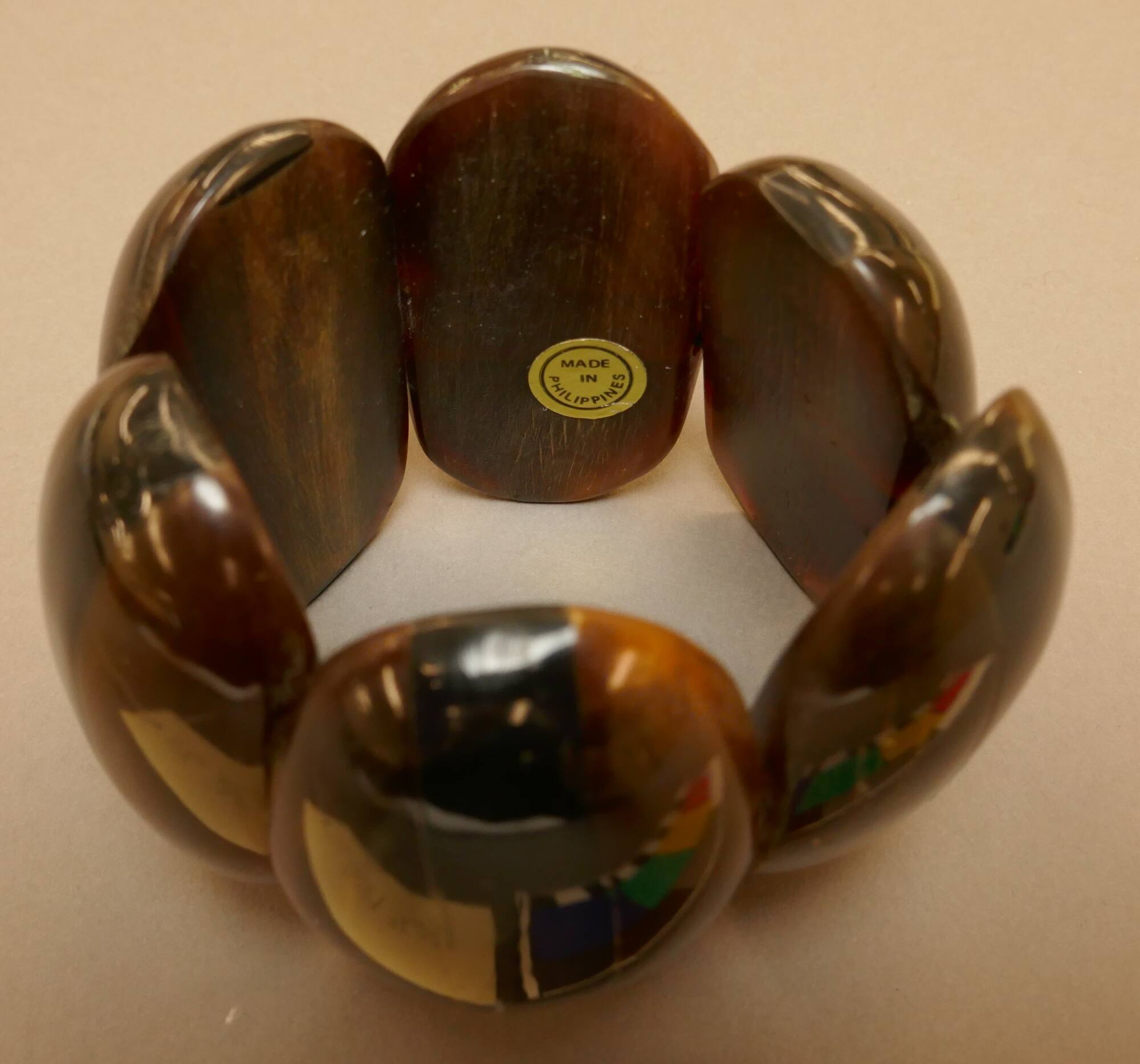 DescriptionA bracelet of six oval brown and black horn discs attached with elastic cord.
