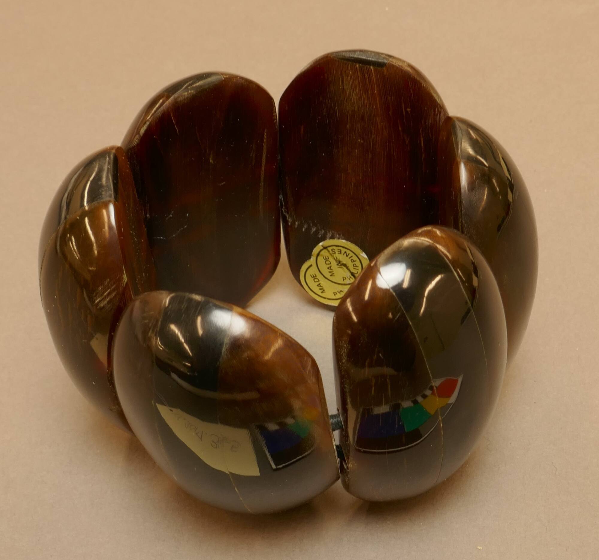 DescriptionA bracelet of six oval brown and black horn discs attached with elastic cord.