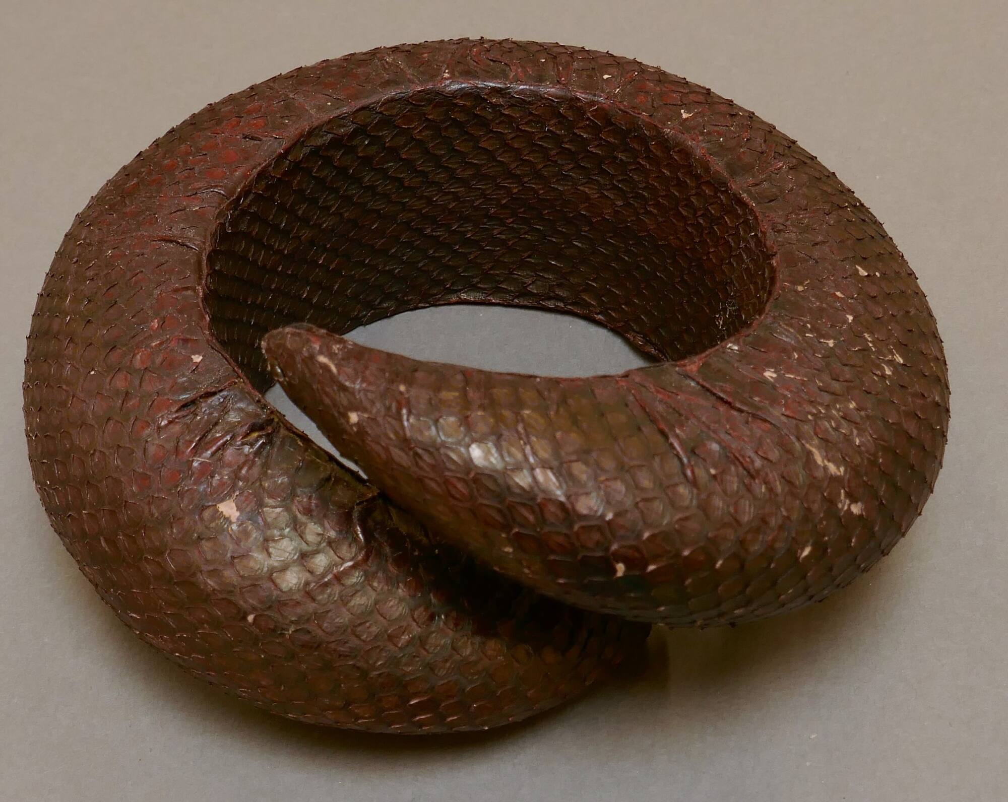 DescriptionA wooden bangle covered in brown snakeskin, in the form of an incomplete circle with flared points.