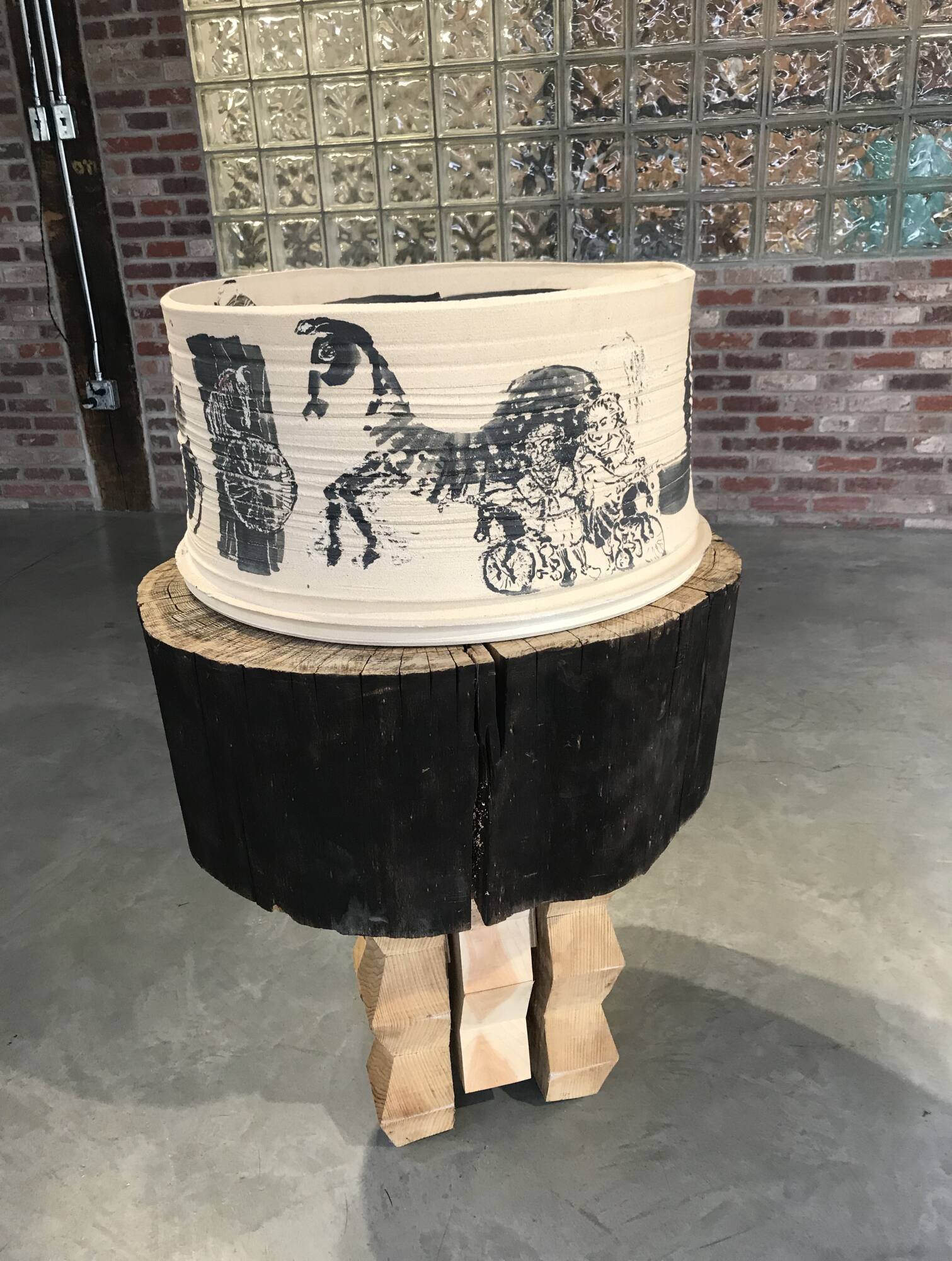 DescriptionA large cream clay cylinder atop a pedestal composed of a blackened tree trunk. The trunk is supported by eight pieces of zigzag cut timber. The clay cylinder’s exterior is decorated with black drawings of horses, trees, and figures. The interior has thick black S-shaped and geometric lines.Exhibition HistoryClay, Lines and Fire, Belger Arts Center, Kansas City, MO, September 1, 2017 to December 16, 2017, no cat.