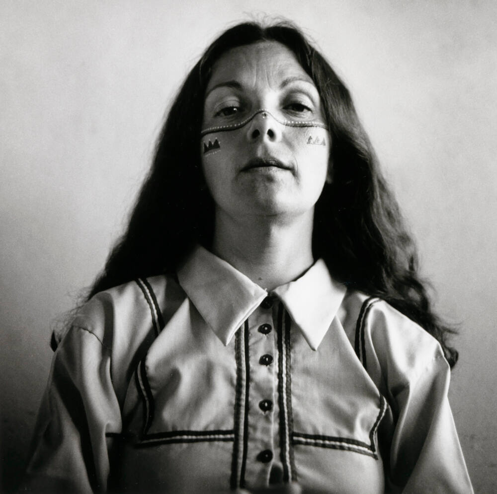 DescriptionImage of a woman whose long wavy hair is parted down the center. She wears a collared shirt which is buttoned up to her neck. Her face is painted with tiny dots which extend across the brim of her nose to the edges of her face. She looks down at the viewer.Gallery LabelIn 1979, Graciela Iturbide spent two months living among the Seri Indians, a once-nomadic Indigenous group living in the Sonoran Desert of northwest Mexico, near the United States-Mexico border. Commissioned by the Mexican government, Iturbide used her camera to document the group’s changing lives as they adapted to modern culture.