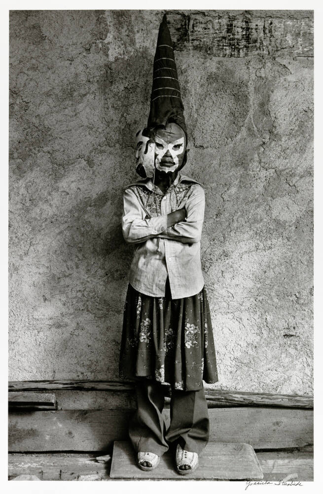 DescriptionImage of girl wearing a mask with a tall pointed hat, buttoned-up shirt, skirt, and pants. Another mask is worn on the side of her face. She stands against a roughly textured wall with her arms crossed.Provenance