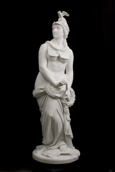 DescriptionThe sculpture, carved from white marble, depicts an armor-and-drapery-clad female figure. She wears a soft cap on her head atop which an eagle with outstretched wings perches. Her cap is trimmed with a laurel wreath crown. A section of her long, wavy hair is braided and drapes across her breast, right shoulder, and down her back. The figure stands barefoot on an armored breastplate that rests on a circle based signed “J. H. Haseltine, F. Rome, 1869.” She poses with one hip cocked to the side. She holds a laurel wreath in one hand, arm extended. With her other hand, she sheaths her sword.Exhibition History