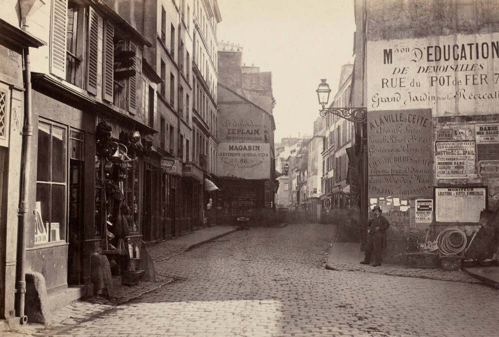 This street (named for the famous philosopher René Descartes) was located in an older part of Paris and slated for demolition. This is one of the many photographs Charles Marville took of Paris during the radical redesign and modernization of the city in the 1860s. Originally trained as a painter, Marville became an acclaimed photographer of landscapes, architecture, and people.