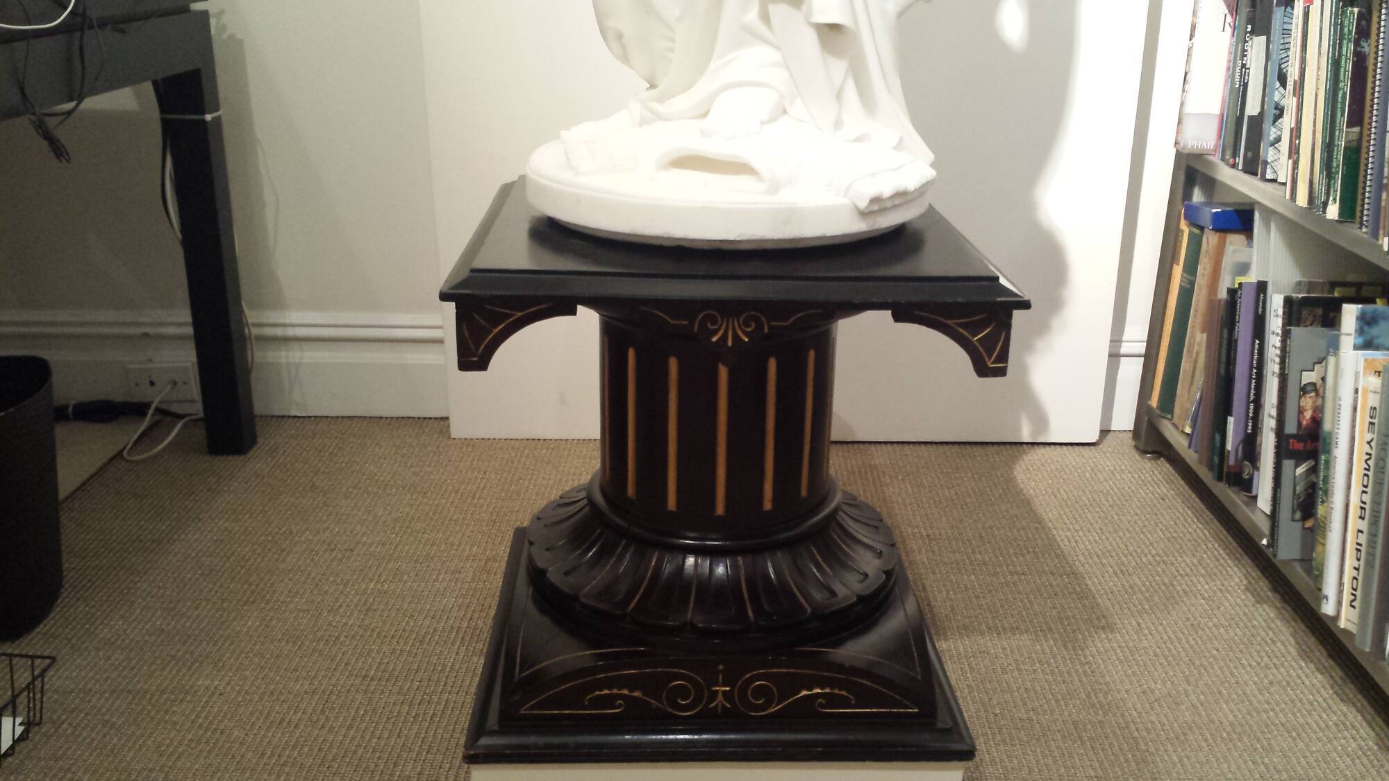 DescriptionThe wooden pedestal has been ebonized, which gives it a dark brown/black coloration. The pedestal has a square base from which arched element rises. This arched element is enhanced on its vertical sides with delicate, shallowly carved, thin lines and scroll work that are gilded. A fluted drum, the recesses of which are gilded, rises above the arched element. The base of this drum is composed of wide, flat petal-, or tongue-shaped elements, each separated by a stripe of gilding. The top of the circular fluted drum is flat and square, its dimensions matching that of the bottom square base. Below each corner of the square top of the pedestal, are decorative elements that together read almost like a capital for the drum. As with each of the other zones that compose this pedestal, this area is also decorated with thin, shallowly carved designs that are gilded.Provenance