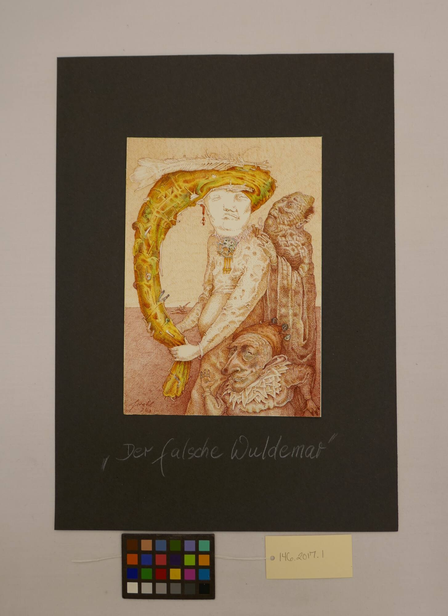 DescriptionDer Falsche Wuldemar is a vertically oriented drawing featuring three figures. The “false ruler” character of the title is in the center of the composition, wearing an oversized, yellow turban topped with a long feather. This person holds the long, hanging end of their turban at the left of the composition in front of their body, which is turned that direction. There are a variety of small objects stuck in and on the turban. Another character, apparently an old man, stands at the right of the composition, behind the central figure, with his hands on that figure’s upper back. The third figure, also aged, is in the lower right corner, visible only from the chest up. He faces the left with his proper right arm raised in front of his face and his proper left arm held behind his back. This figure wears a ruff around his neck and a rust-colored, beanie-like cap with three blue bells on the top of it.ProvenanceSibylle Wahl, the artist’s widow, 2007–2017;