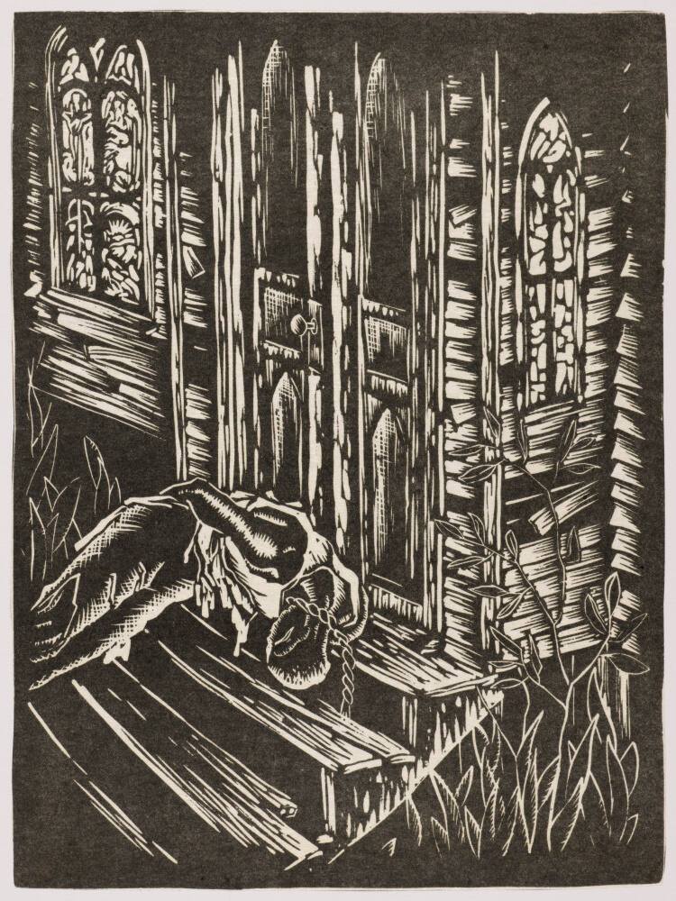 DescriptionThe vertically oriented black-and-white print "By Parties Unknown" depicts a lynched black man, hands bound, whose lifeless body has been laid across the wooden steps before the front door of a dilapidated wooden church with a pointed-arch, stained-glass window on each side. The man's body is bent at a right angle. The legs, clad in torn pants, extend out of the composition at its left side and his head is just left of the center of the scene about one-quarter of the way up from its lower edge. The rope around his neck falls between the top and second-to-the-top step. Stylized plants group up on either side of the wooden steps.Gallery Label