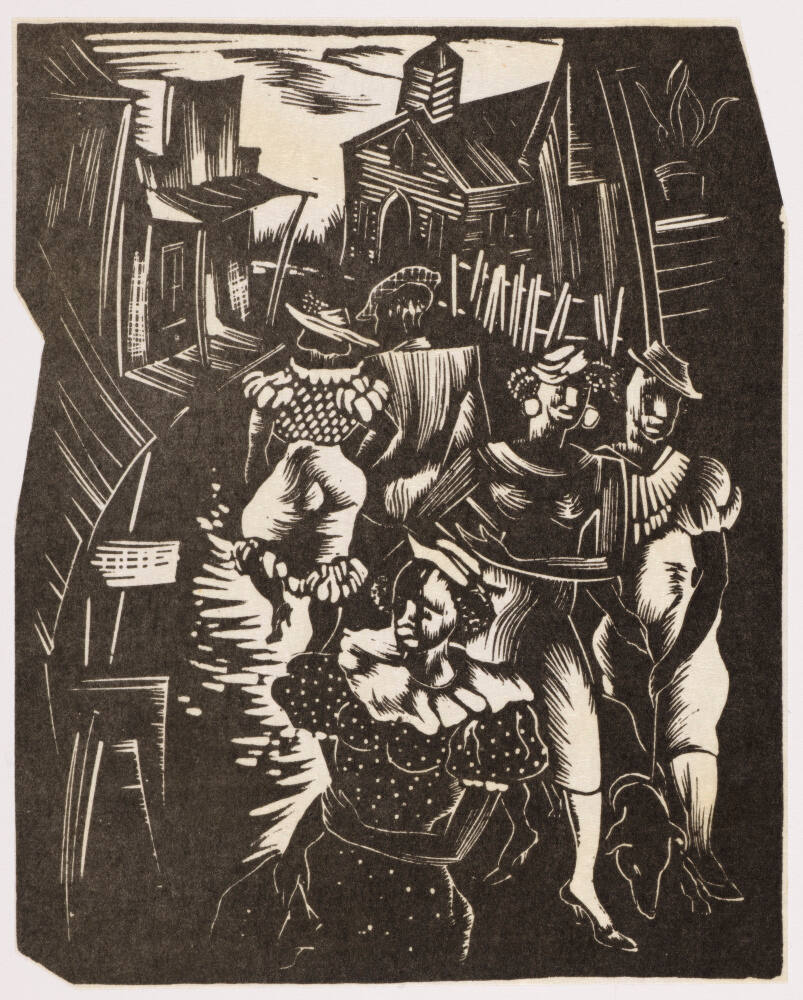 DescriptionThe vertically oriented black-and-white print Sunday Promenade depicts five finely dressed African American figures walking to and fro down a street at the middle of the composition. Closest to the viewer is a woman wearing a hat and polka-dotted dress with a prominent white collar. Her proper left arm is bent at the elbow and crosses over her waist. She carries a bag in her proper right hand and glances over her proper right shoulder. Above her and to the right are a pair of women in dresses, hats, and high heels. The woman on the left wears earrings. The woman on the right walks a large dog who has its nose to the ground. Behind them and walking away from the viewer of the print and into the scene, is a female (left) and male (right) couple. The woman wears a dress with ruffles at the collar, shoulders, and knee-length hem. Her partner wears a suit and a checkered hat. The strolling people are flanked by buildings at the left and right. A portion of a fence appears near the upper quarter of the composition at the right side. Near the top of the scene, at the center, is a building that looks as though it may be a church.ProvenanceAuldlyn Higgins Williams and E.T. Williams, Jr., Sag Harbor, NY, 1996–2018;