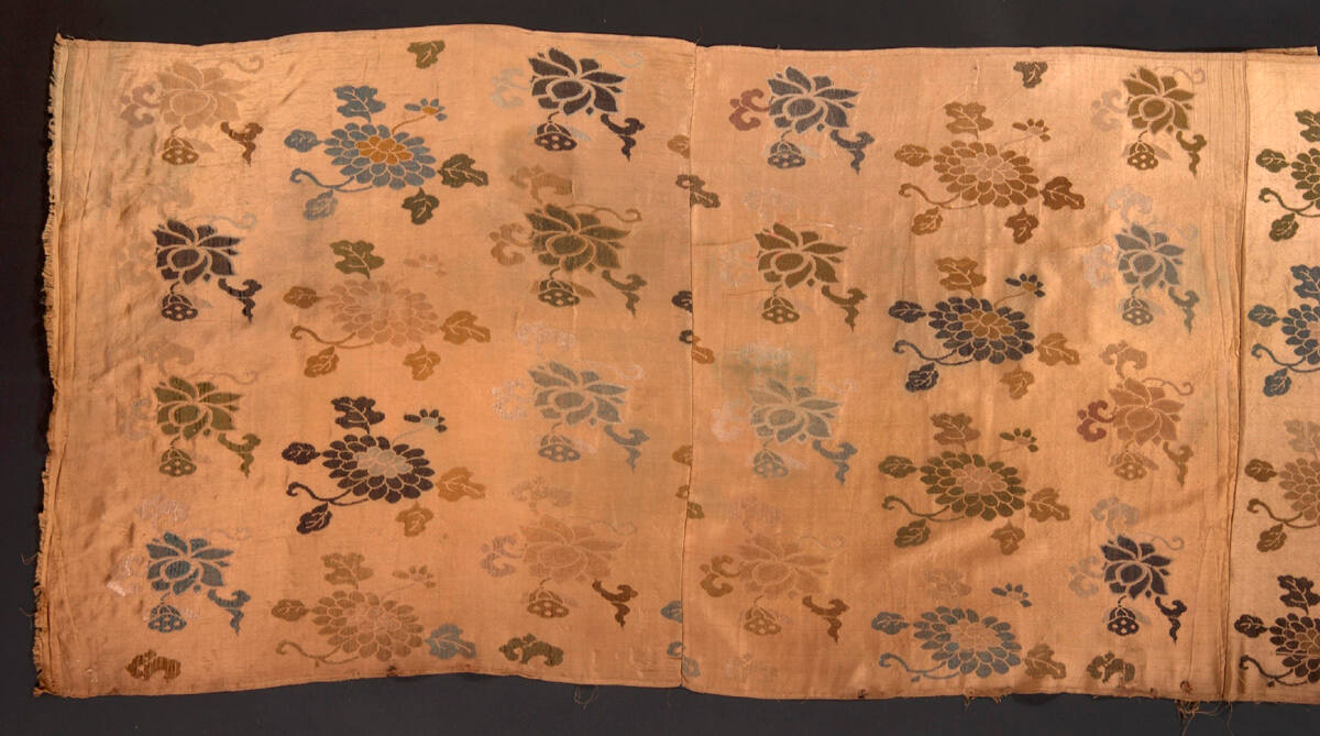 DescriptionLotus and chrysanthemums flowers in blue, yellow and green on a dark blue ground with diaper patterns in silver. Washed: background no longer dark blue.