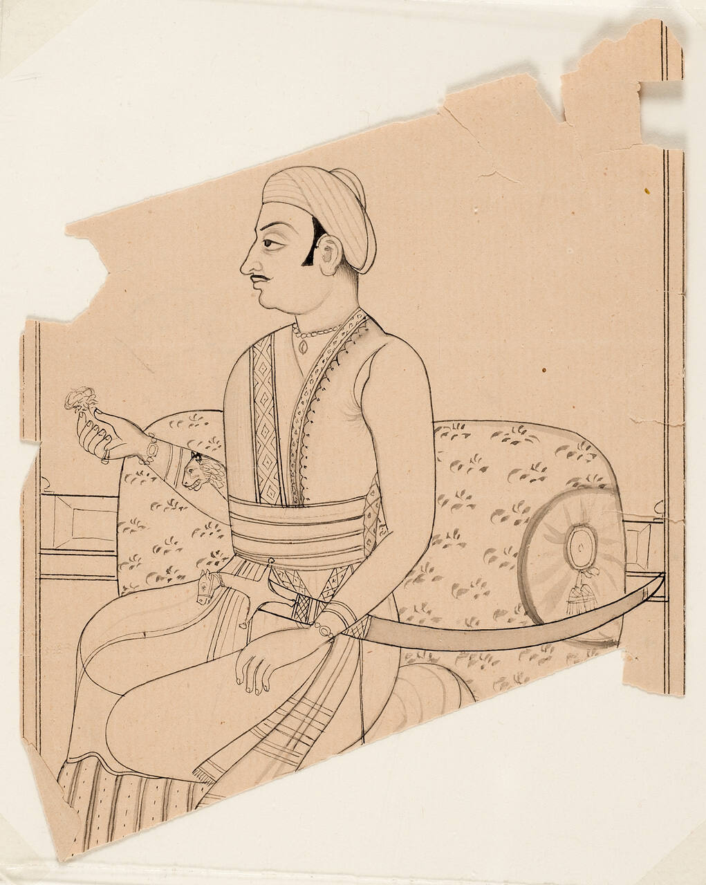 DescriptionThis drawing is in three fragments. This is the largest.Kneeling nobleman facing left, holding a rose. Wears turban, kamarband, and sword, leans against large bolster pillow. Framed by a double line drawn on top and sides, with a small balcony at lower edge. Light ink wash shading on face, garments.