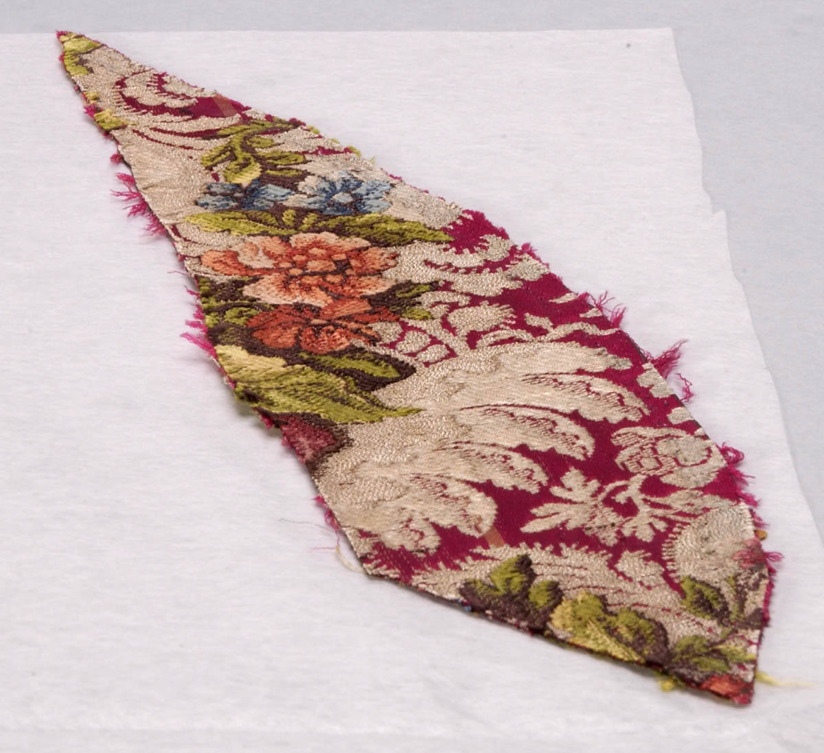 DescriptionFloral design in apricot and green on a background of red and silver.