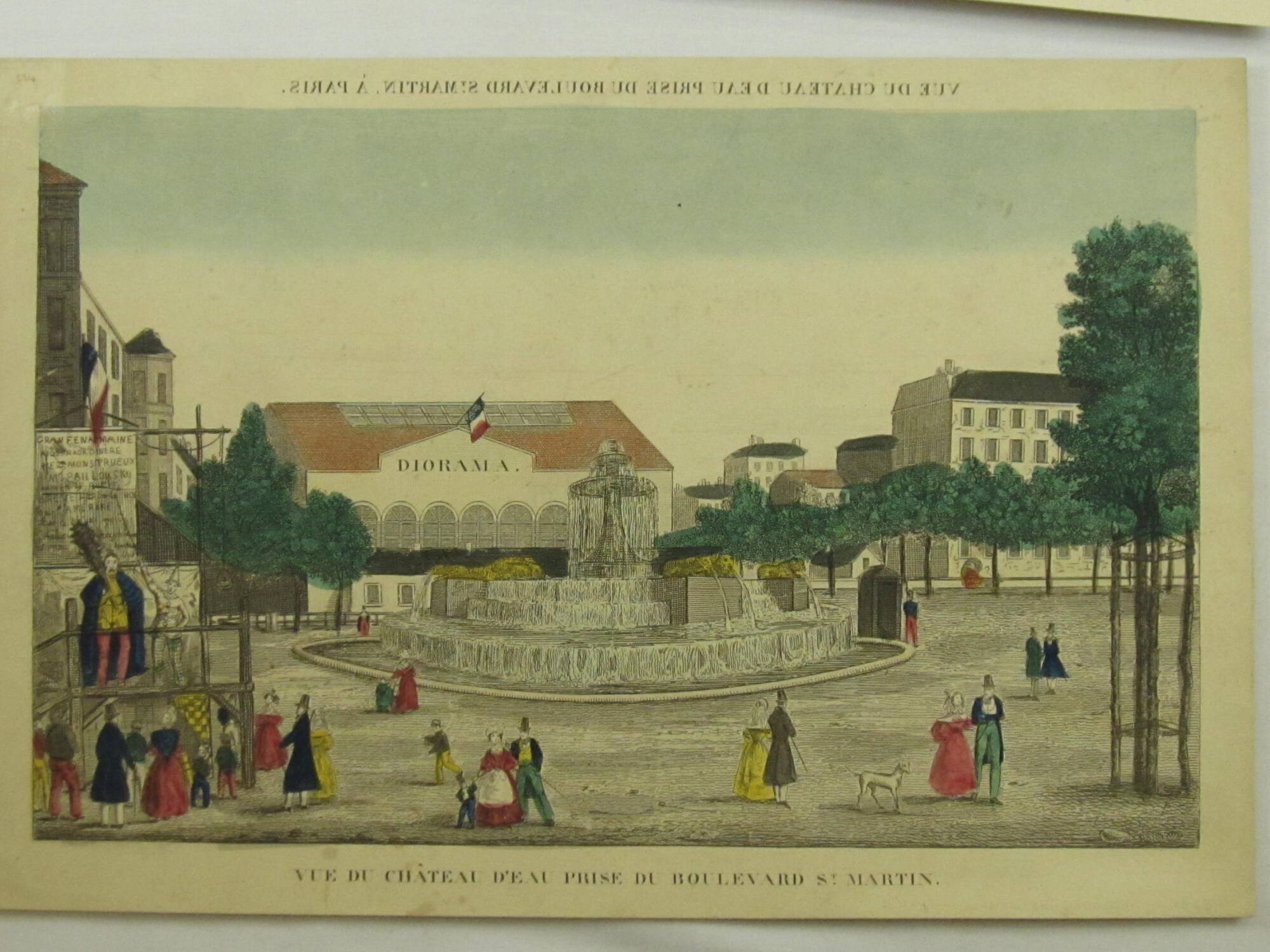 Printed on sheet recto, top, in black ink, in reverse: "VUE DU CHÂTUAU D'EAU PRISE DU BOULEVARD ST. MARTIN Á PARIS.";