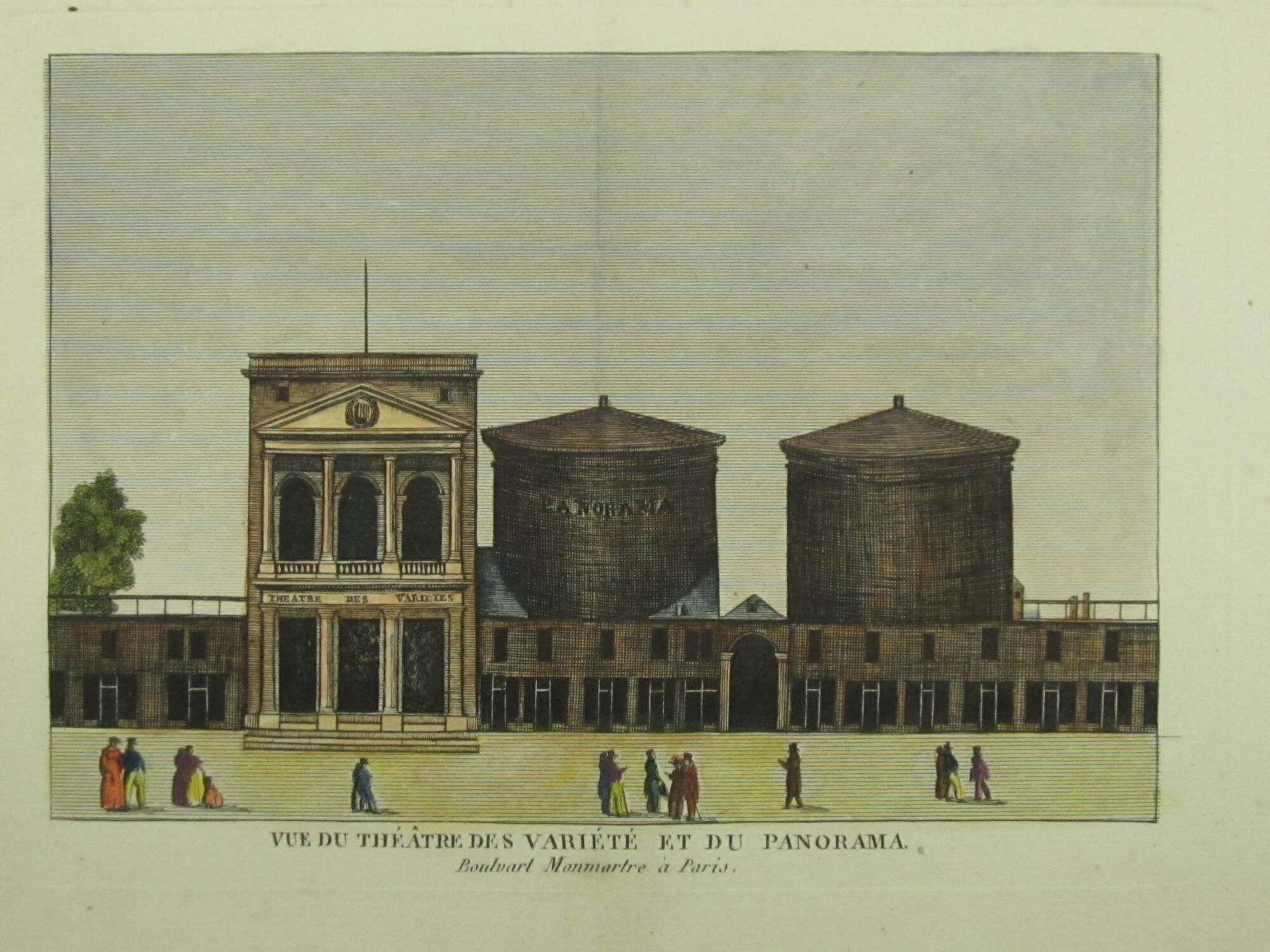 DescriptionColored illustration of a row of buildings with people strolling in the promenade. The buildings are identified as the Théâtre des Variétés and the Panorama.ProvenanceThe Hall Family Foundation, Kansas City, MO, 2017;
