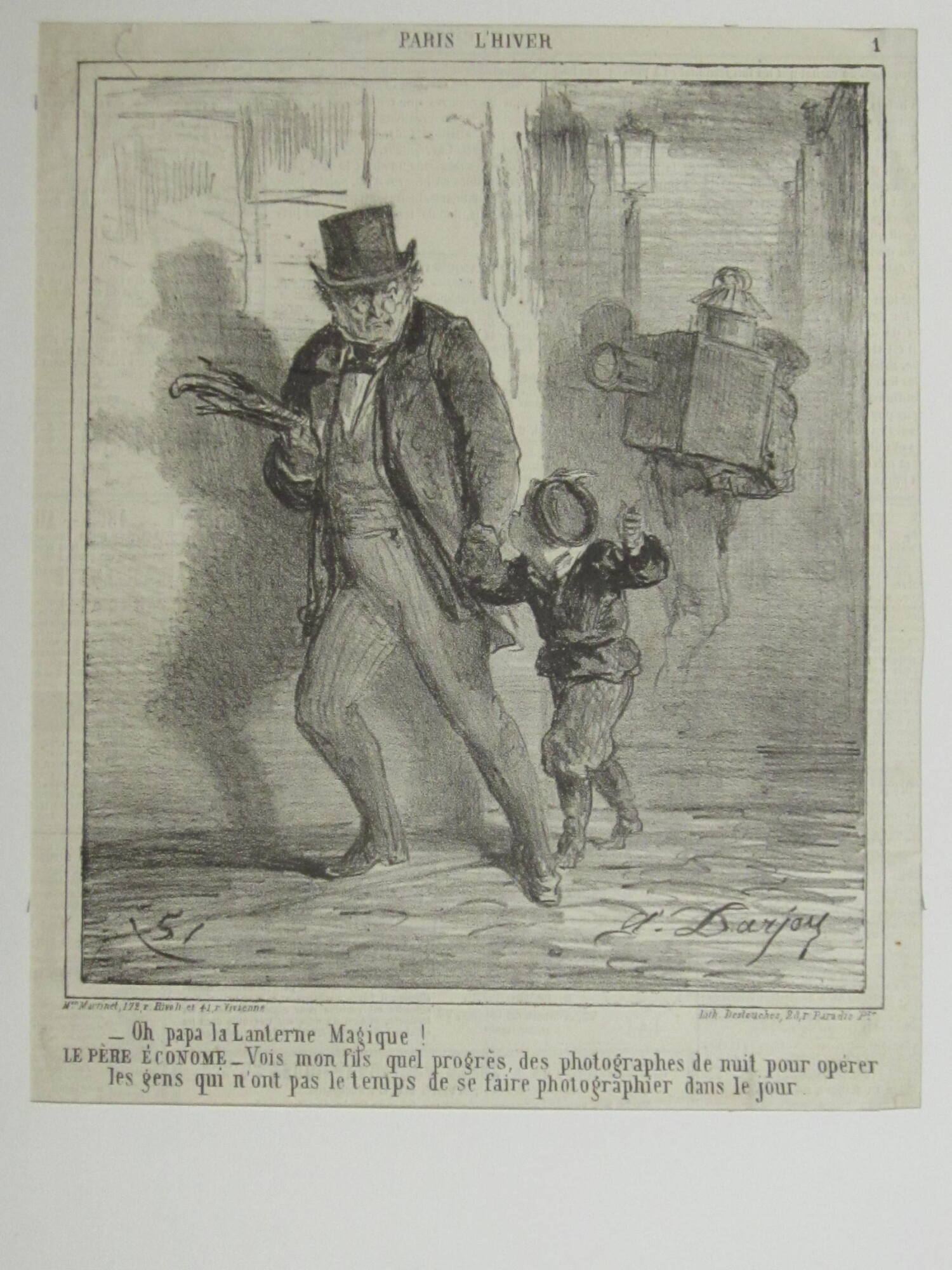 On sheet recto, bottom, in black type: "Oh papa la Lanterne Magique!" [Translation: Oh papa the Magic Lantern" / LE PÉRE ÉCONOME _ Vois mon fils quel progrés, des photographes du nuit pour opérer / les gens qui n'ont pas le tems de se faire photographier dans le jour."