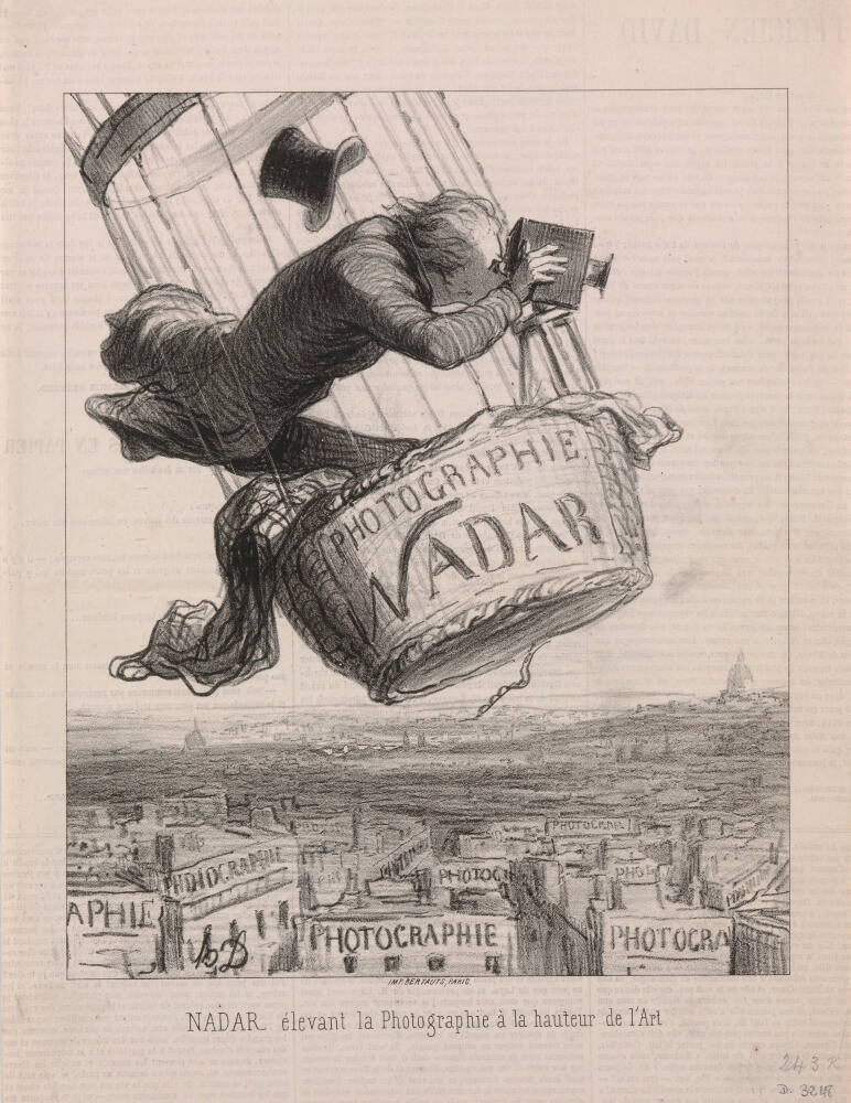 InscribedOn sheet recto, bottom, in black type: "NADAR élevant la Photographie á la hauteur de l'Art" [Translation: NADAR elevating Photography to Art";